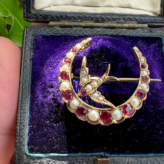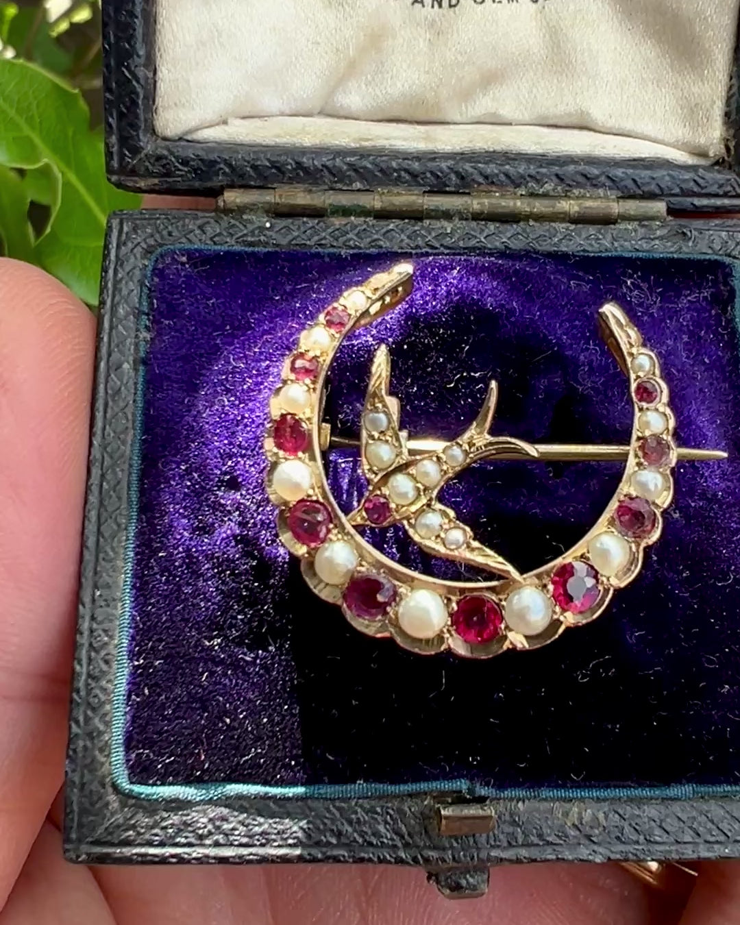 Antique Ruby and Pearl 9CT Gold Swallow and Crescent Brooch