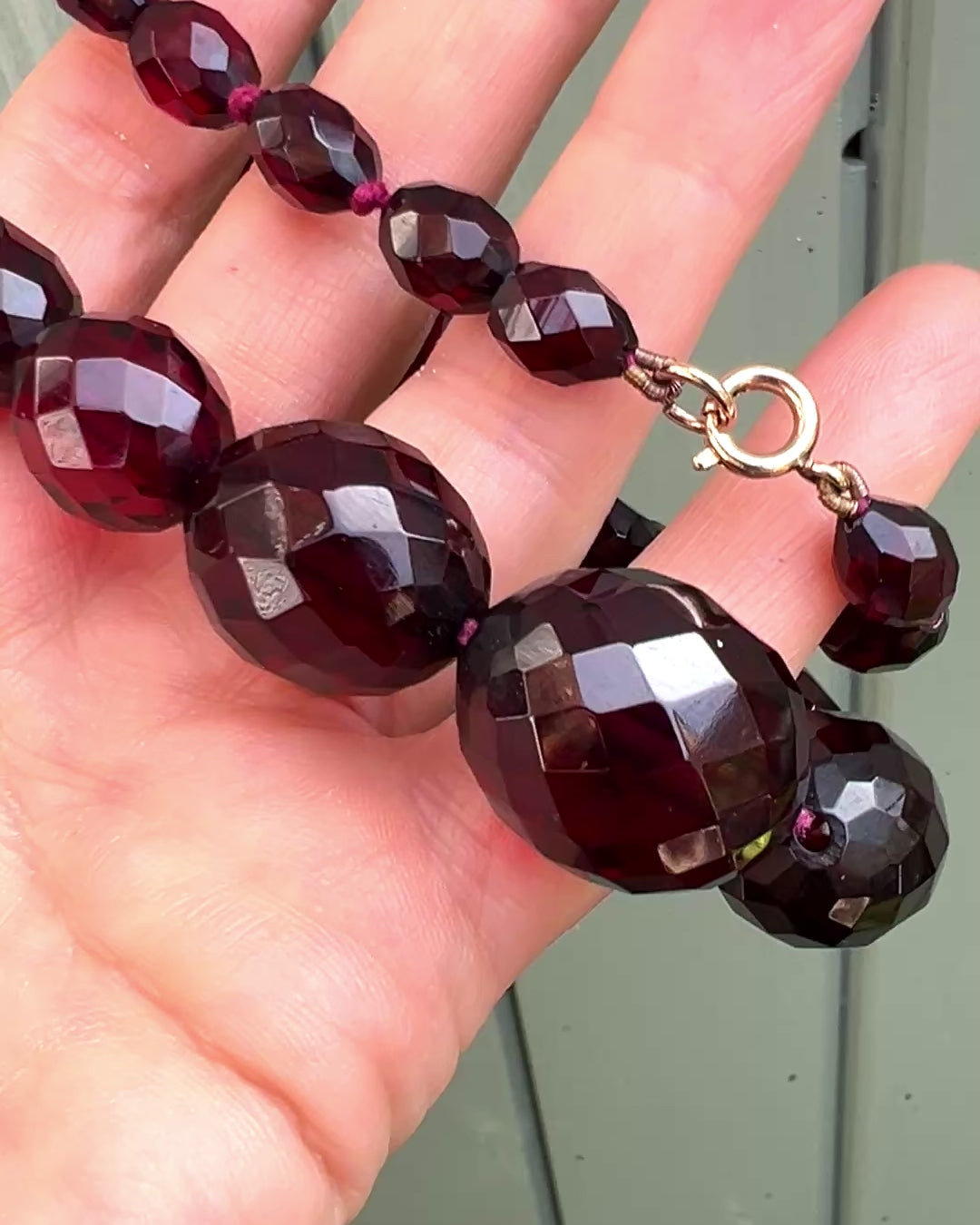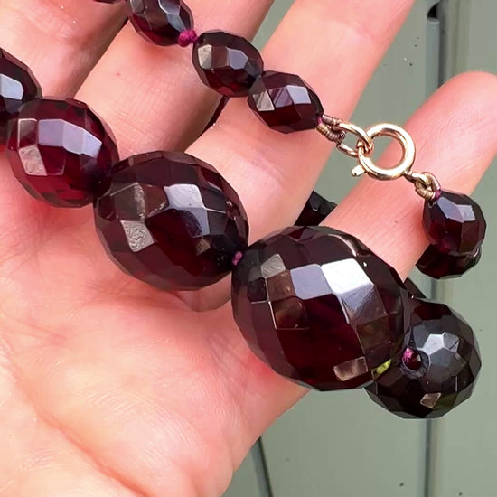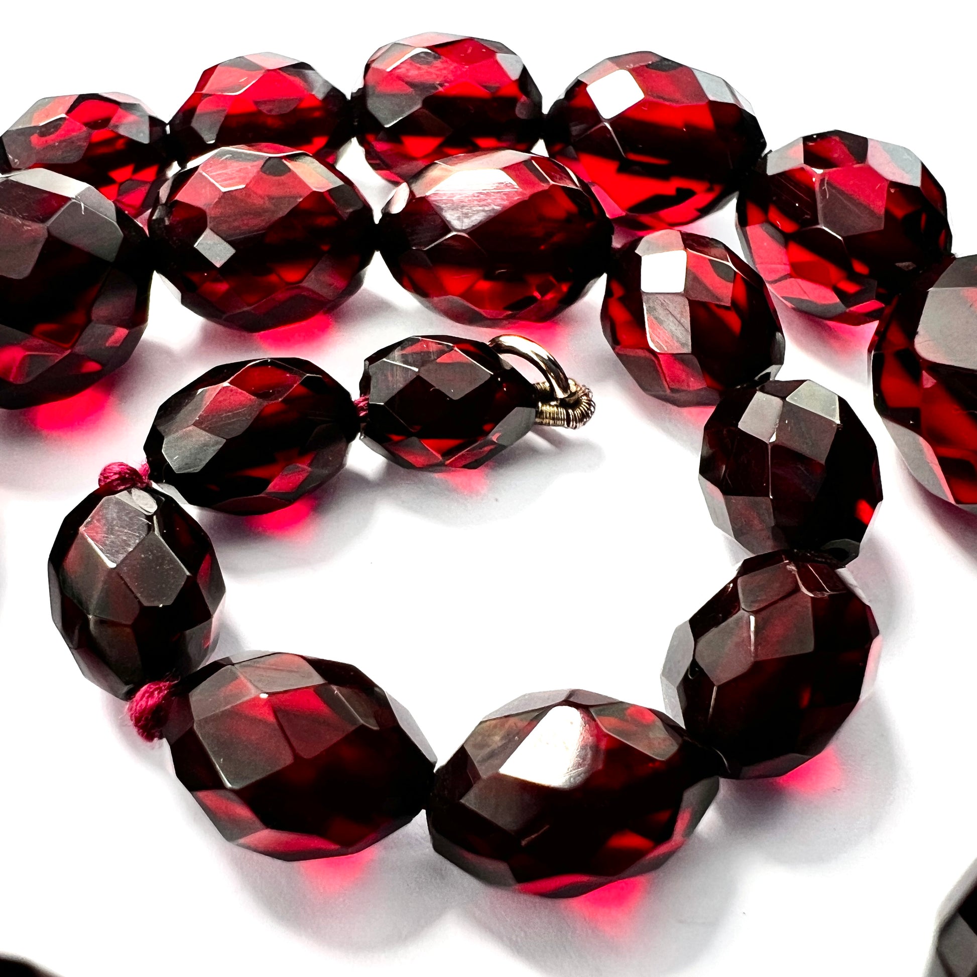 An original Art Deco string of faceted cherry amber Bakelite beads with a solid nine-carat gold clasp. The necklace appears to have its original red silk string and is knotted each side of the third bead from the ends.