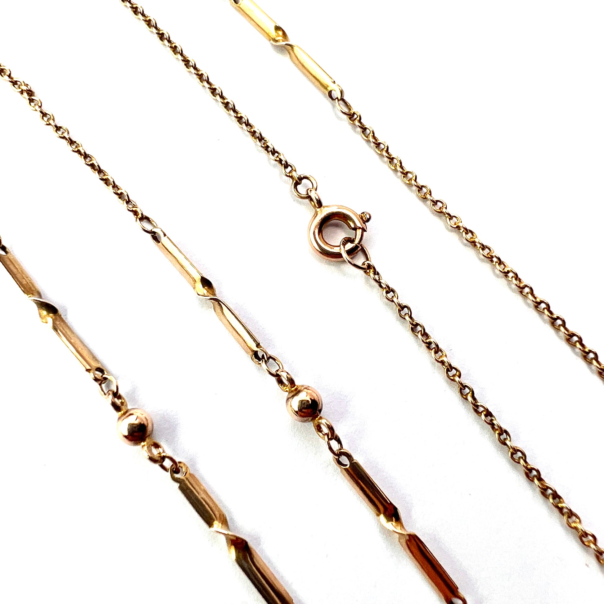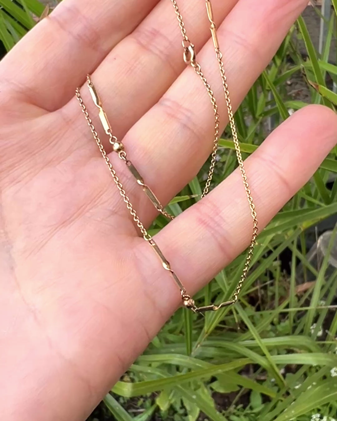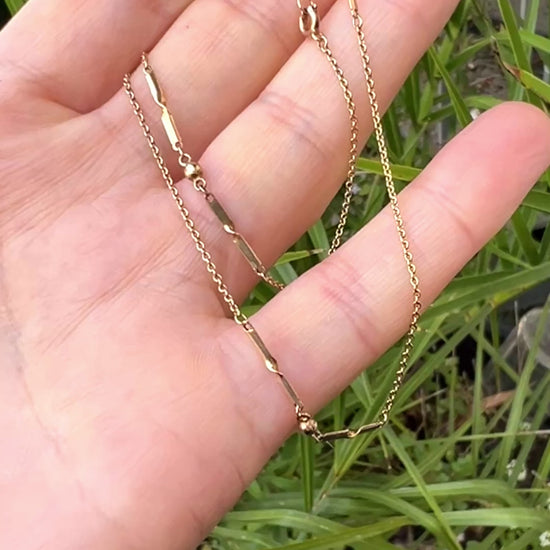 A dainty solid nine-carat gold necklace with links of cable chain interspersed with gold balls and twisted bars.