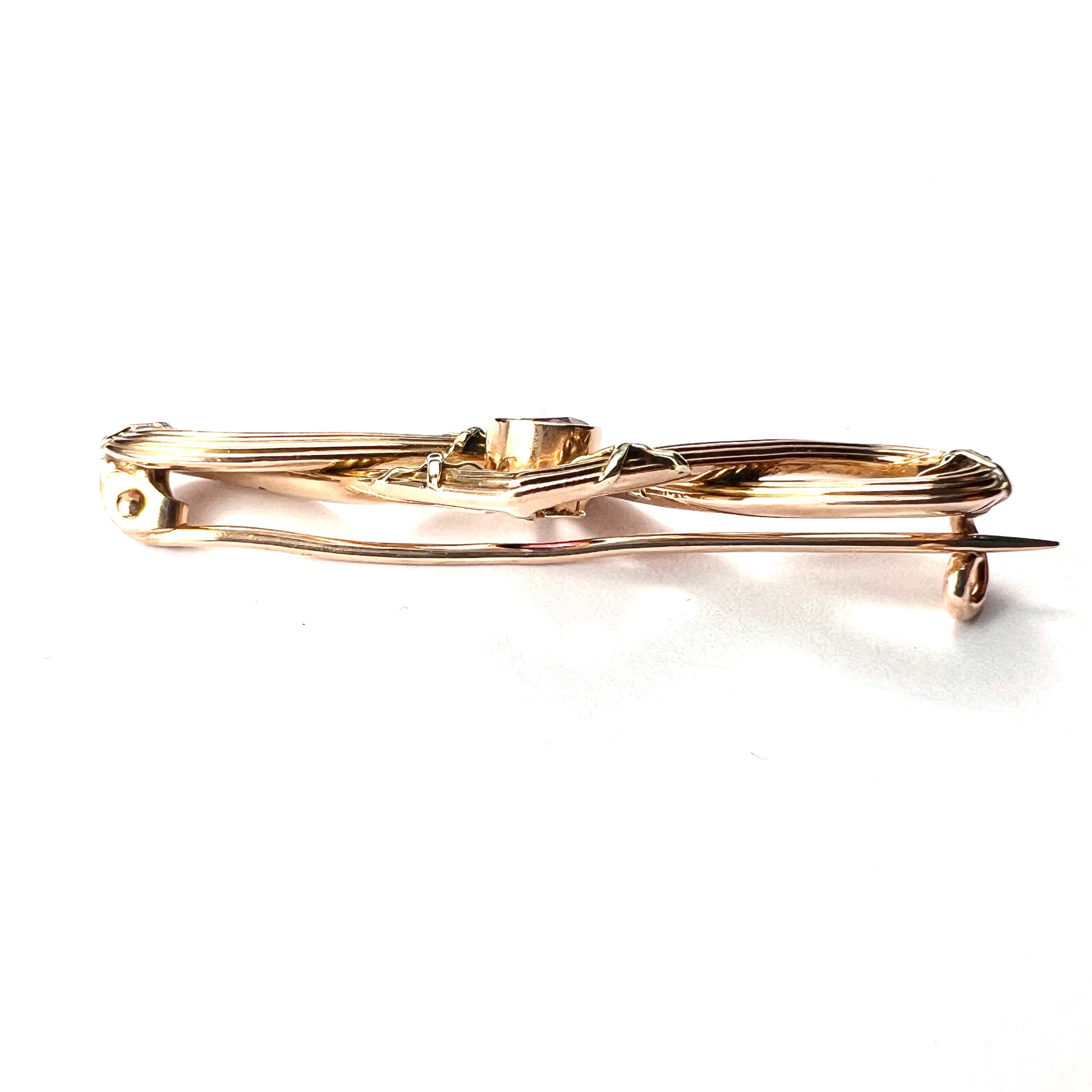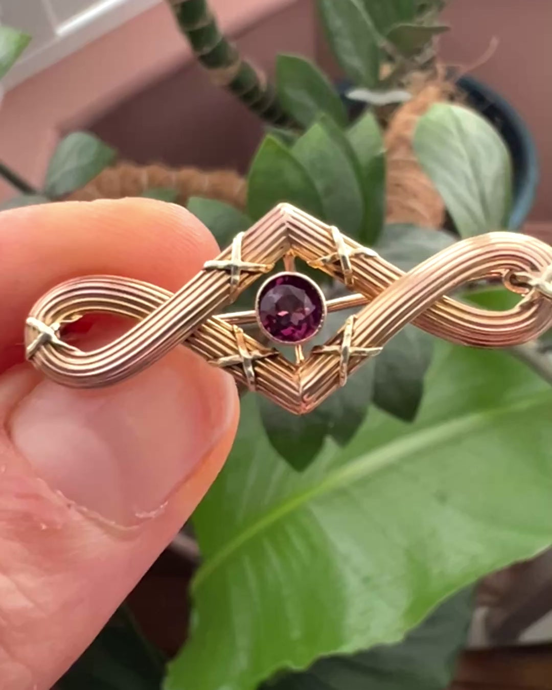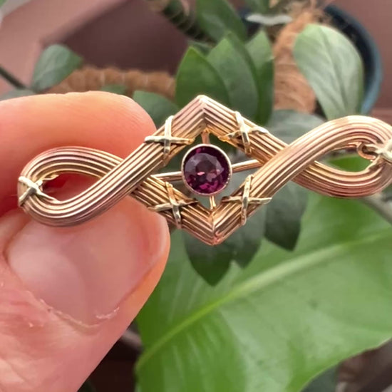 A beautifully constructed Edwardian brooch with an elegant endless knot design surrounding a central purple garnet. The reeded body of the brooch, nice and crisply detailed, is a slightly rosy nine-carat gold with yellow gold cross details.