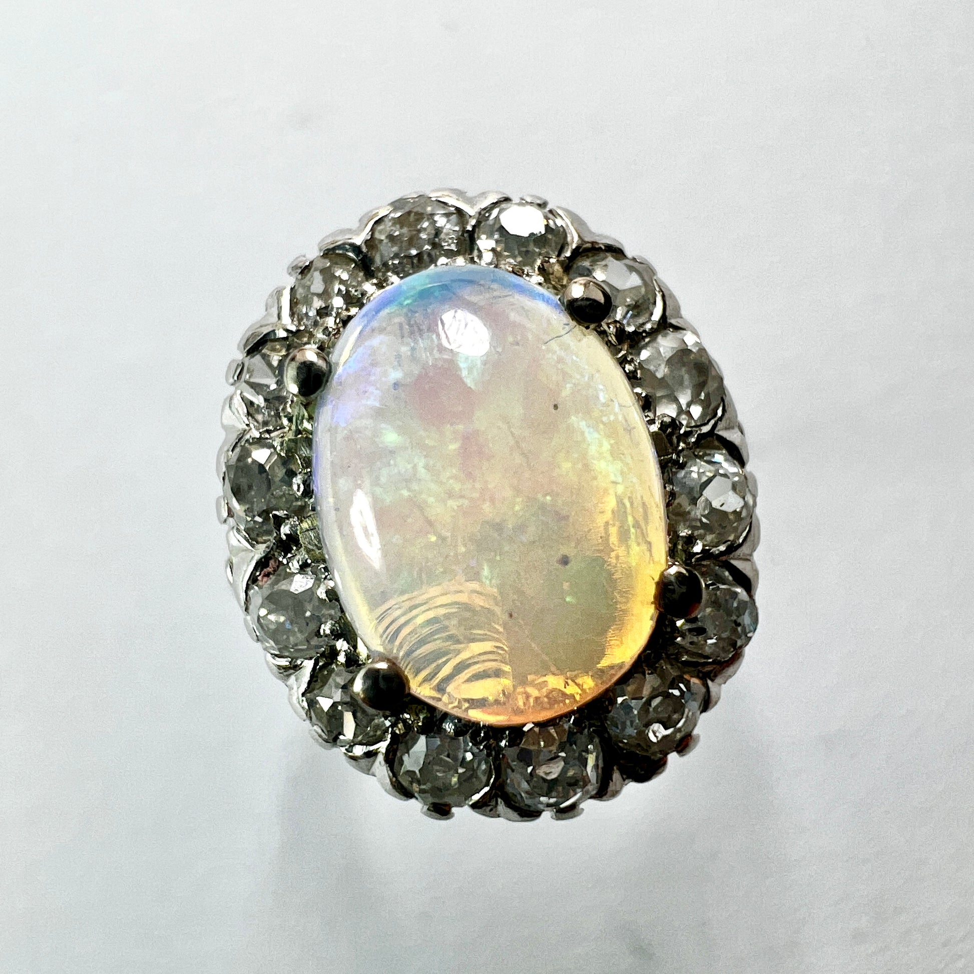 An extraordinarily pretty antique ring in 18-carat white gold showcasing a lovely fiery blue-green opal in a halo of sparkling old-cut diamonds.