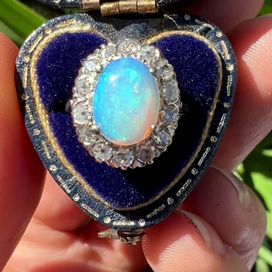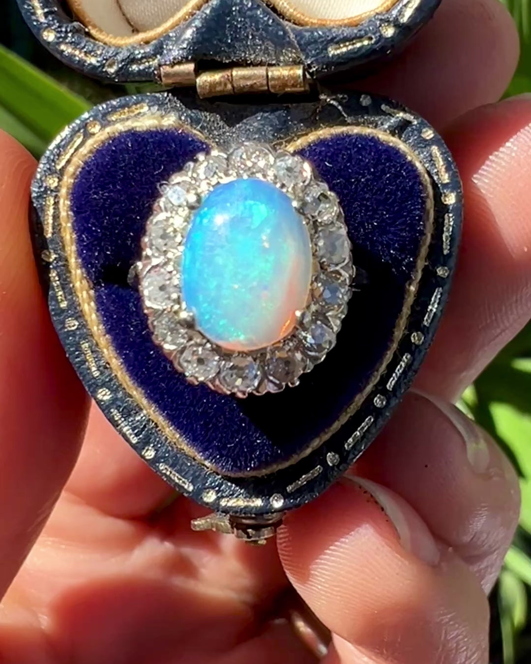 CONDITION: The ring overall is in excellent antique condition. The opal has a chip at one edge on the back which under certain lights (under magnification and if you're really looking for it) can be seen through the front, see final photo taken in the most unflattering light possible! This has been reflected in the price, although we'd be willing to bet no one would ever notice it while they're admiring your finger so it's a chance to snap up a beautiful bargain.