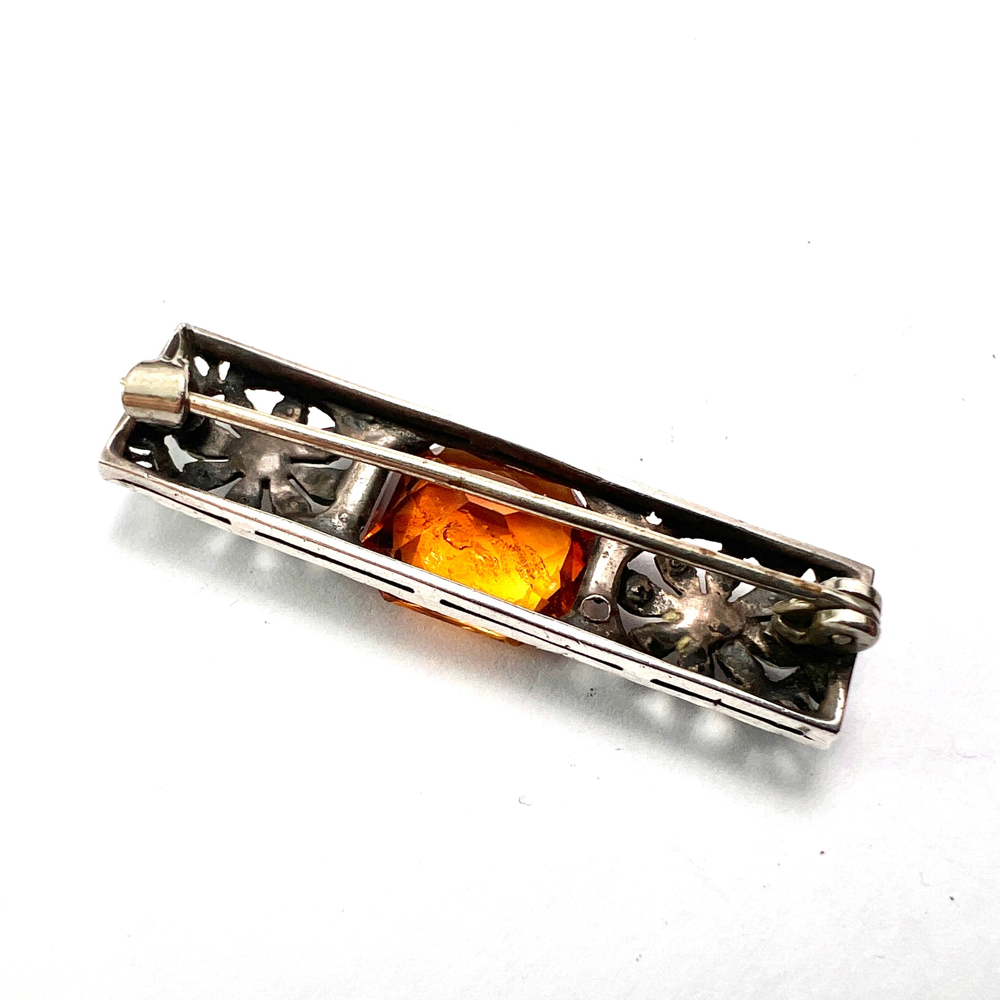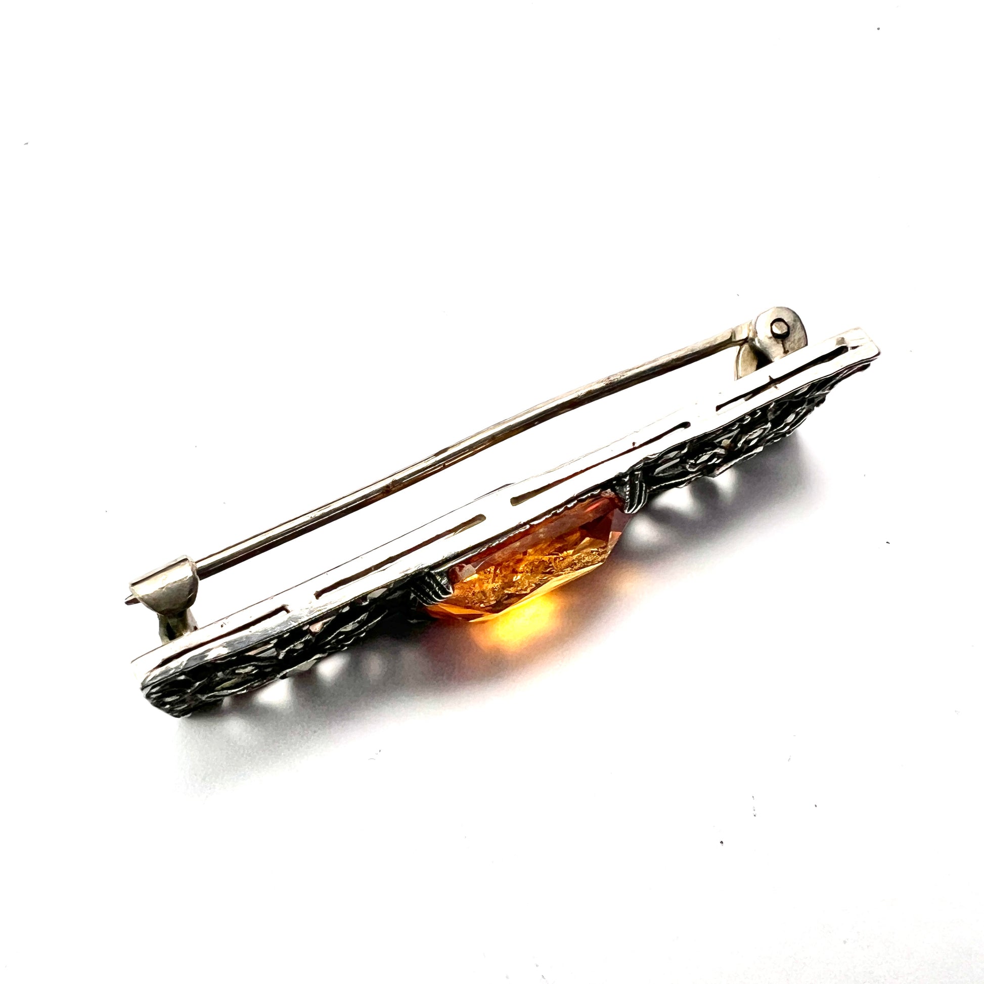 A pretty antique solid silver brooch featuring a lovely large orange citrine between twinkly marcasite-studded flowers.