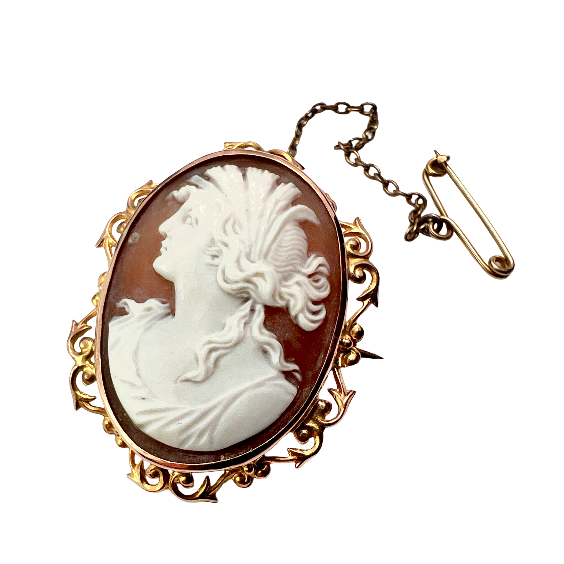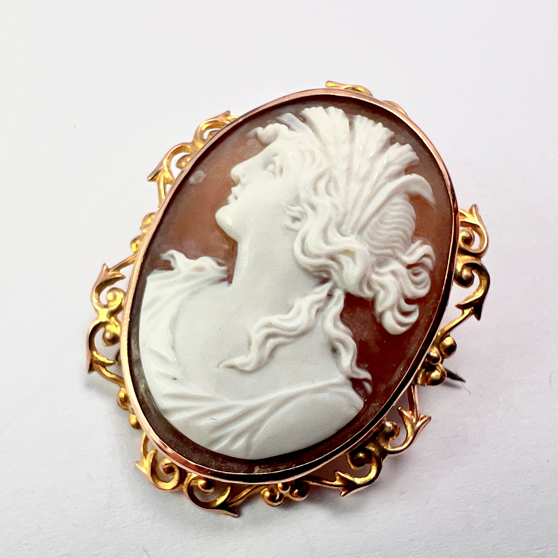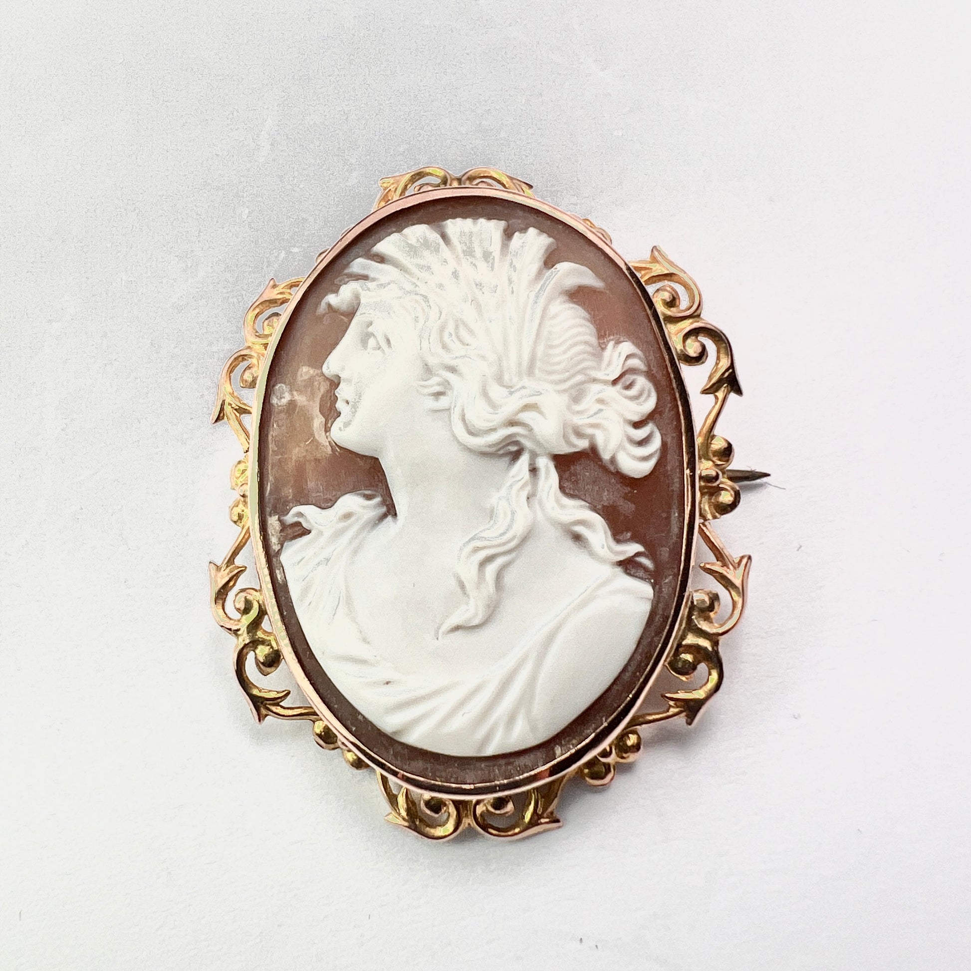 This fine 19th century cameo brooch is beautifully carved in shell and mounted in a pretty nine-carat gold frame which has a lovely rich high-carat colour.