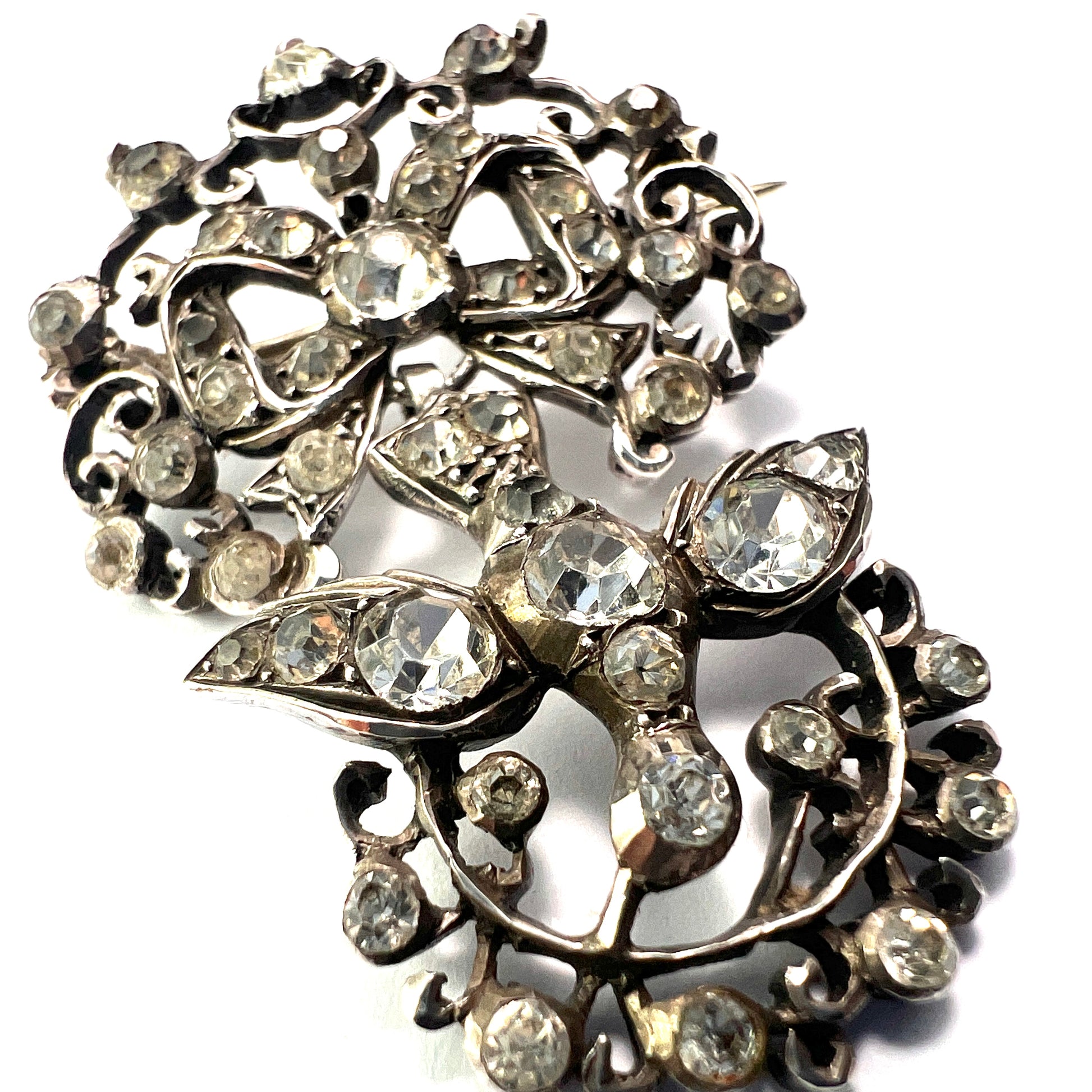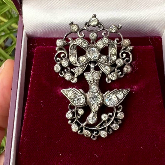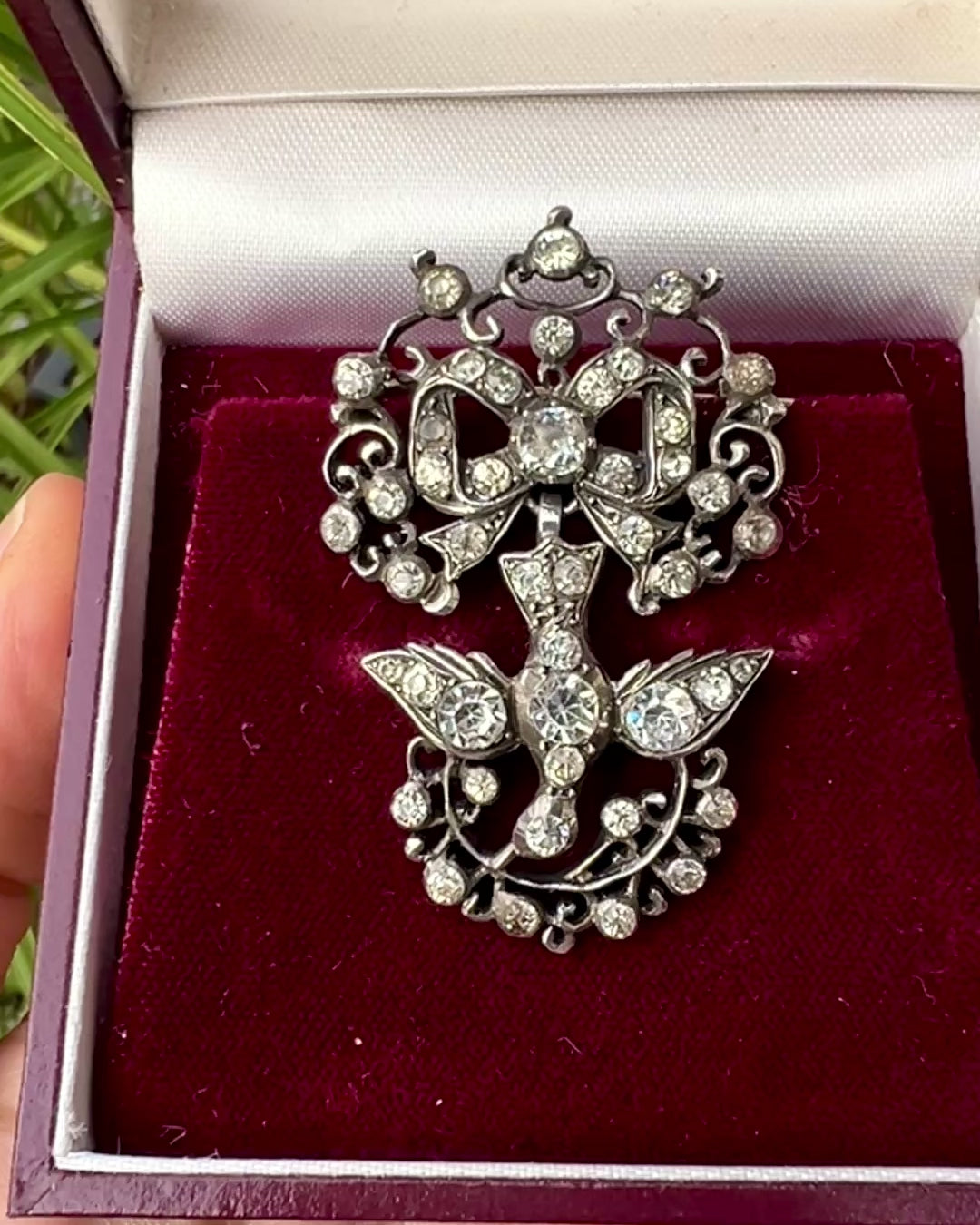 A beautiful late Georgian/early Victorian silver Saint Esprit articulated brooch set with sparkling old single-cut pastes. The Saint Esprit ("Holy Spirit") is a religious symbol which was popular in Catholic France from the late 18th century, particularly in the Normandy region.