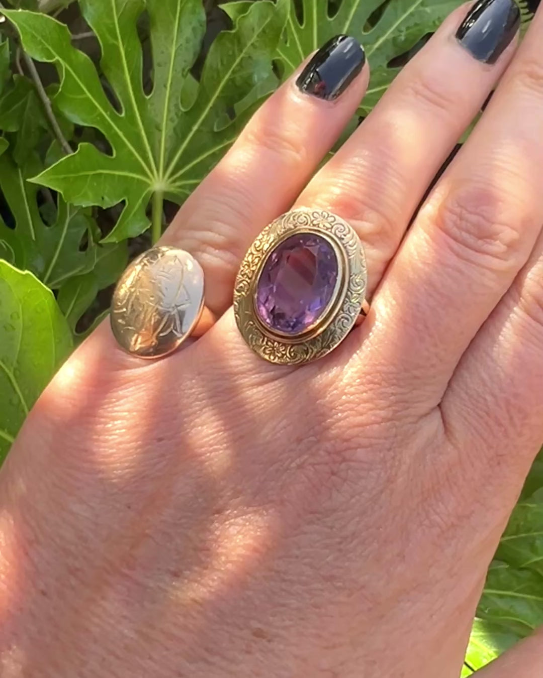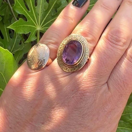 A stunning vintage gold ring set with a large faceted purple amethyst set into a wide gold frame with beautiful Victorian-style scrolling-foliate chasing.