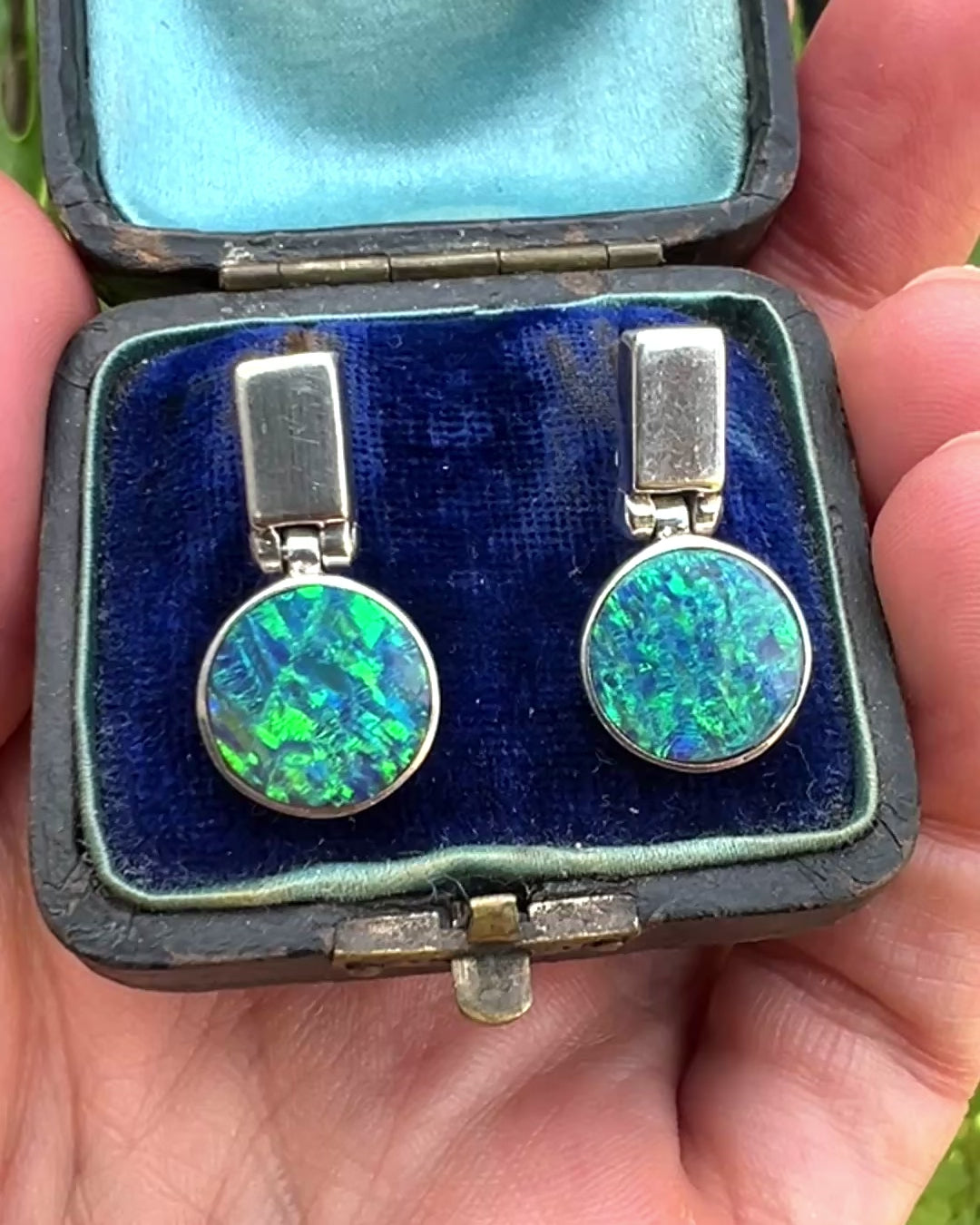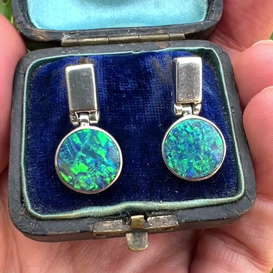 Solid silver Modernist style earrings set with beautiful fiery blue-green opal doublets.