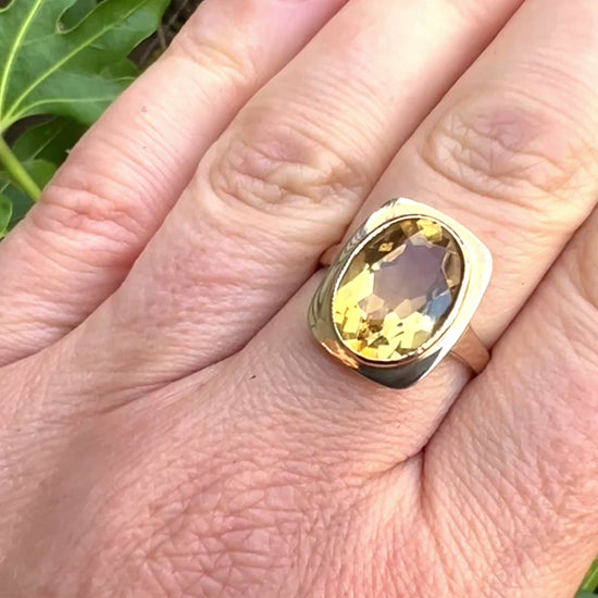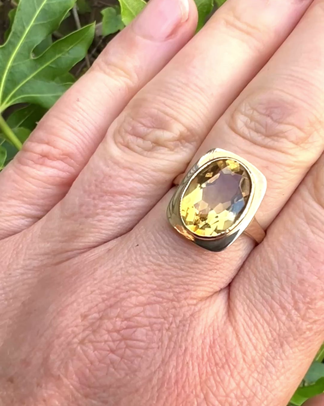 A vintage gold rectangular ring with a lovely bezel-set oval pale-honey citrine.