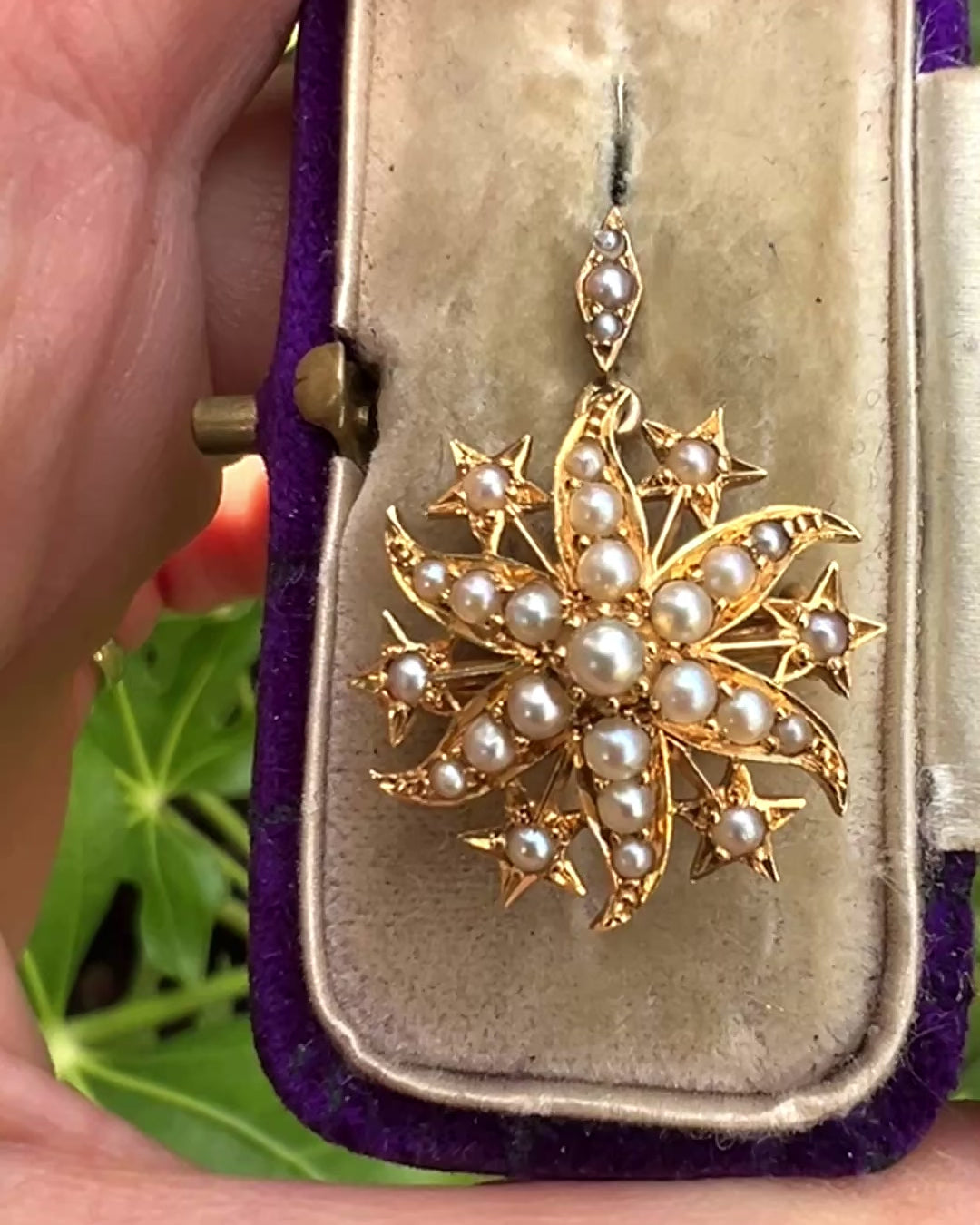 A lovely little 18-carat-gold piece set with tiny gleaming seed pearls. The back is mounted with both pendant and brooch fittings so it's easy to switch between the two.