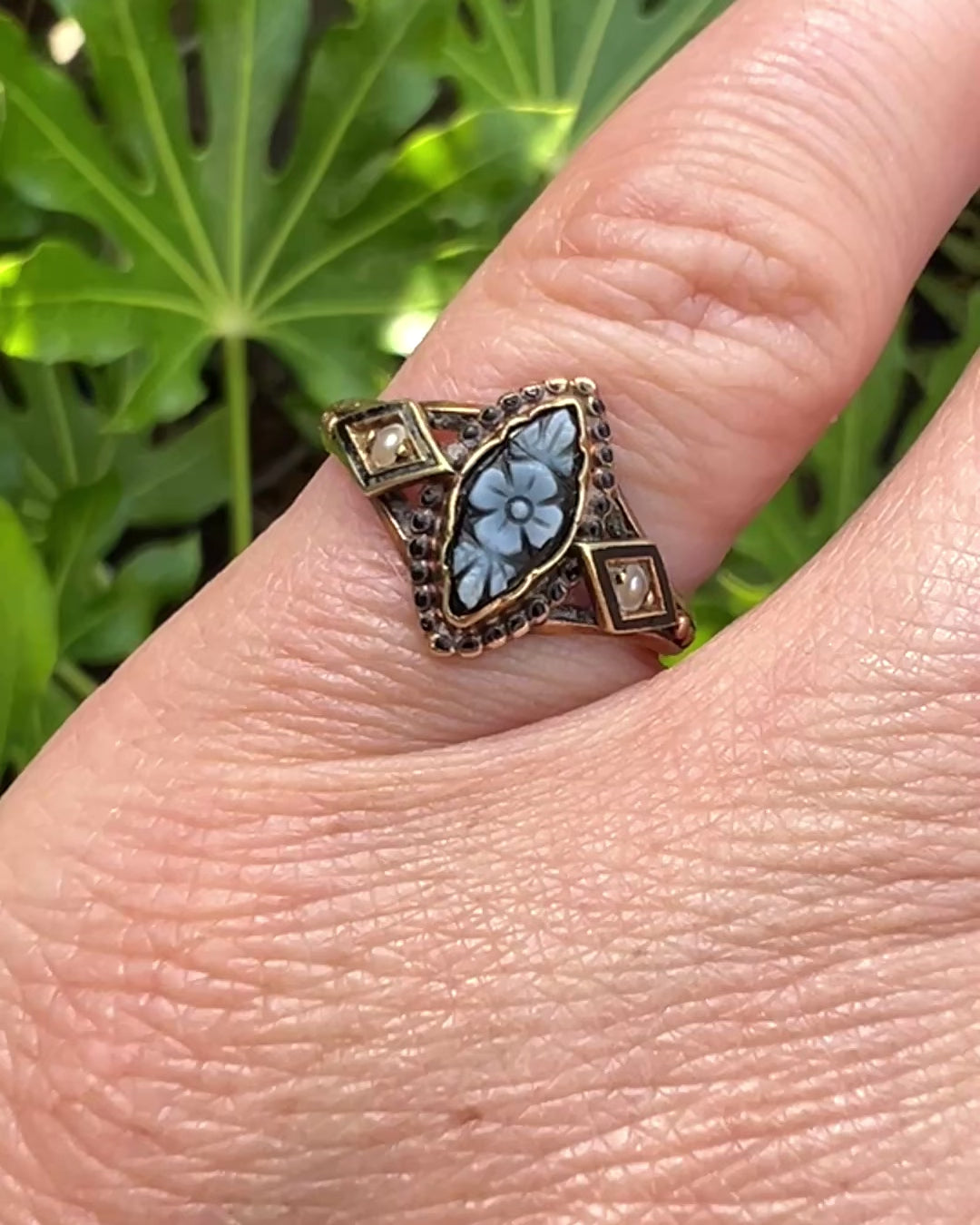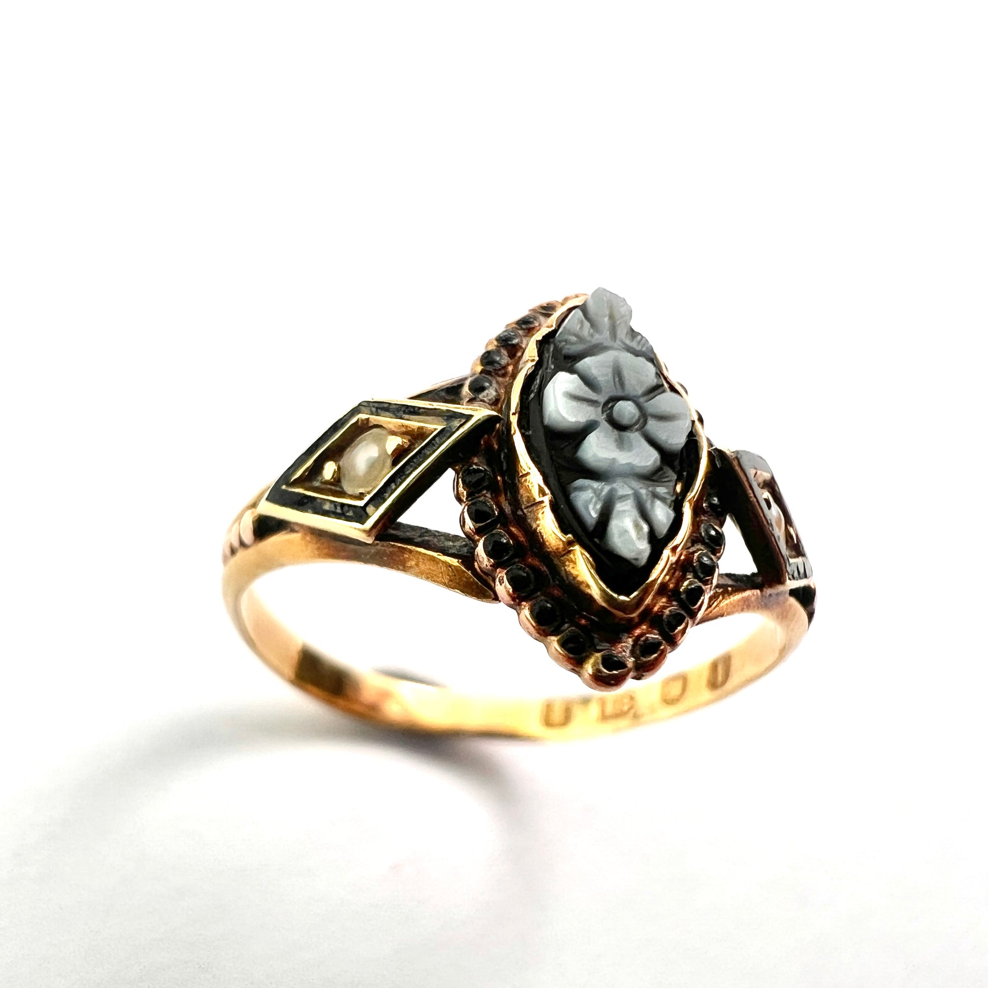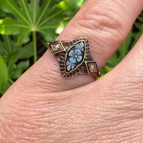 A beautiful Victorian ring in rich 18-carat gold with a pretty marquise-shaped sardonyx panel carved into a flower and lovely diamond-shaped shoulders set with gleaming seed pearls.