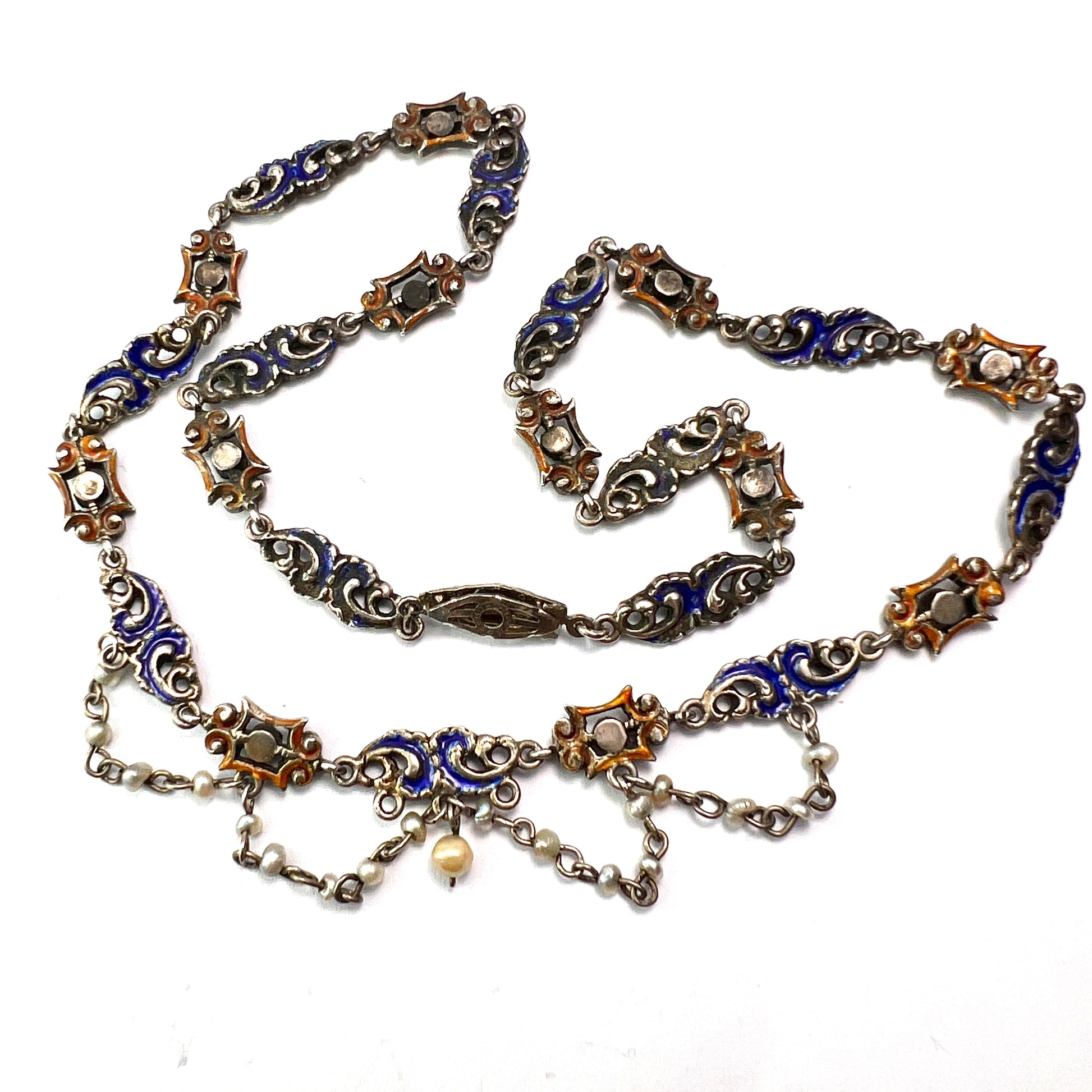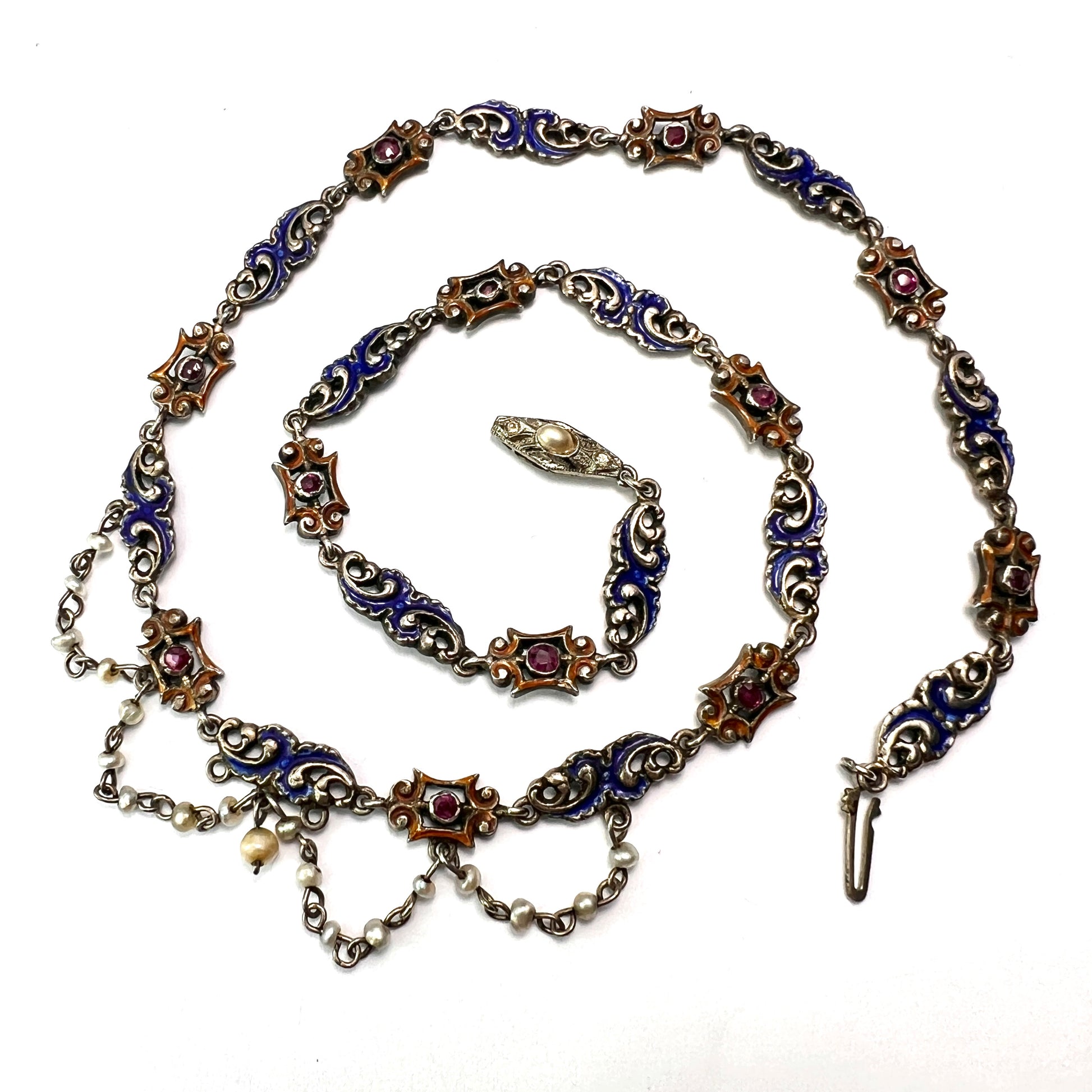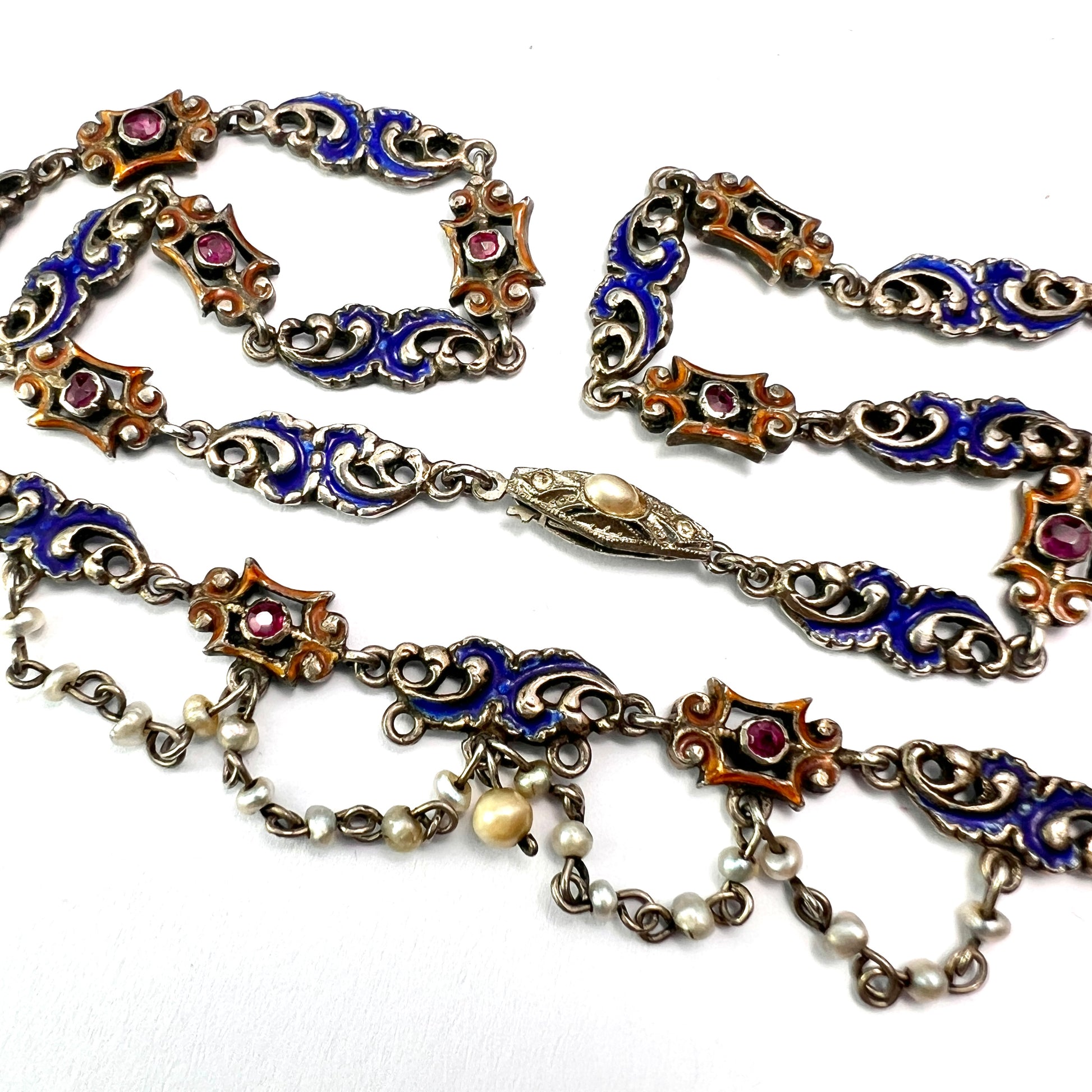 A lovely antique Austro-Hungarian silver chain, with blue and ochre enamelling on each link tiny ruby-coloured accent stones (untested). The front has a swagged section adorned with tiny gleaming seed pearls.