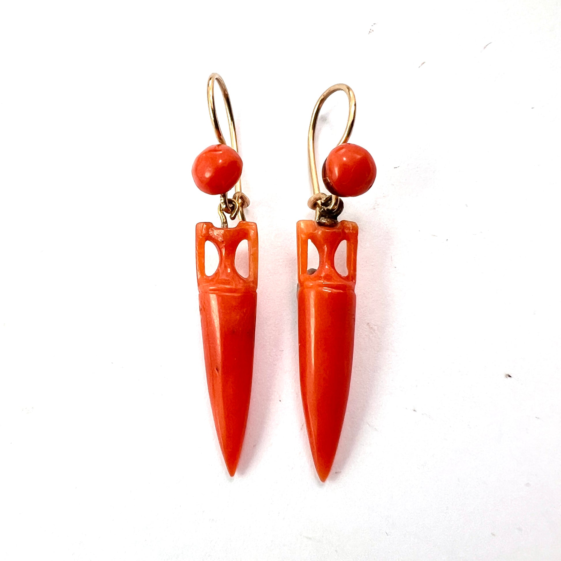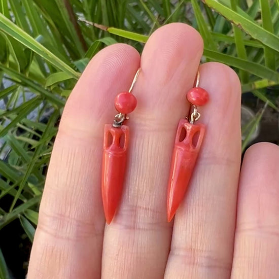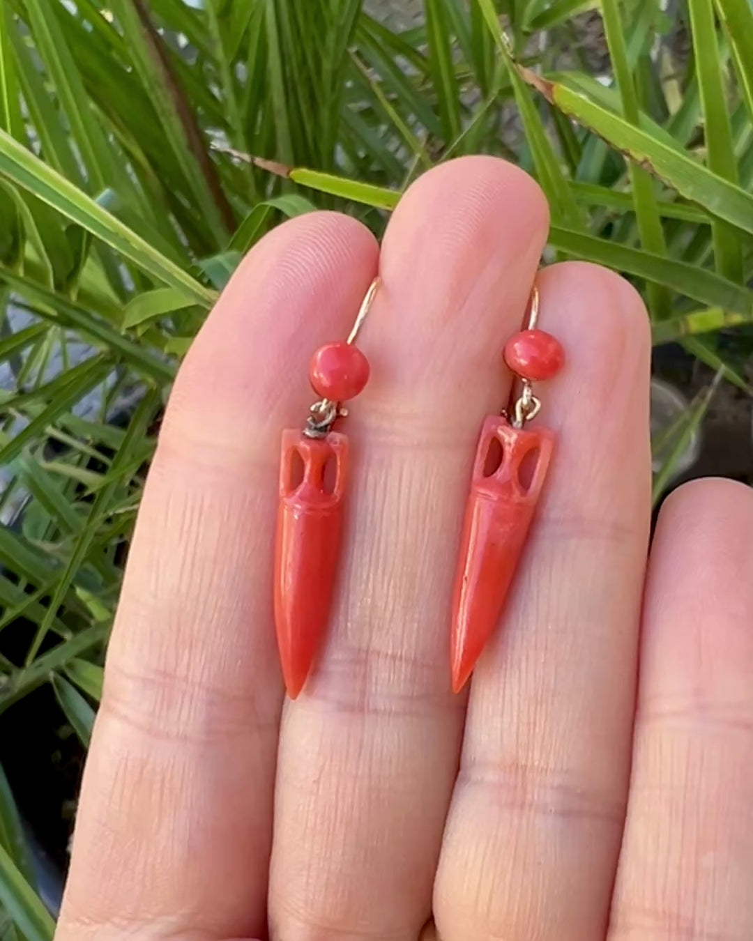 Dainty little Victorian earrings with coral dangles hand carved into the shape of elongated amphorae.