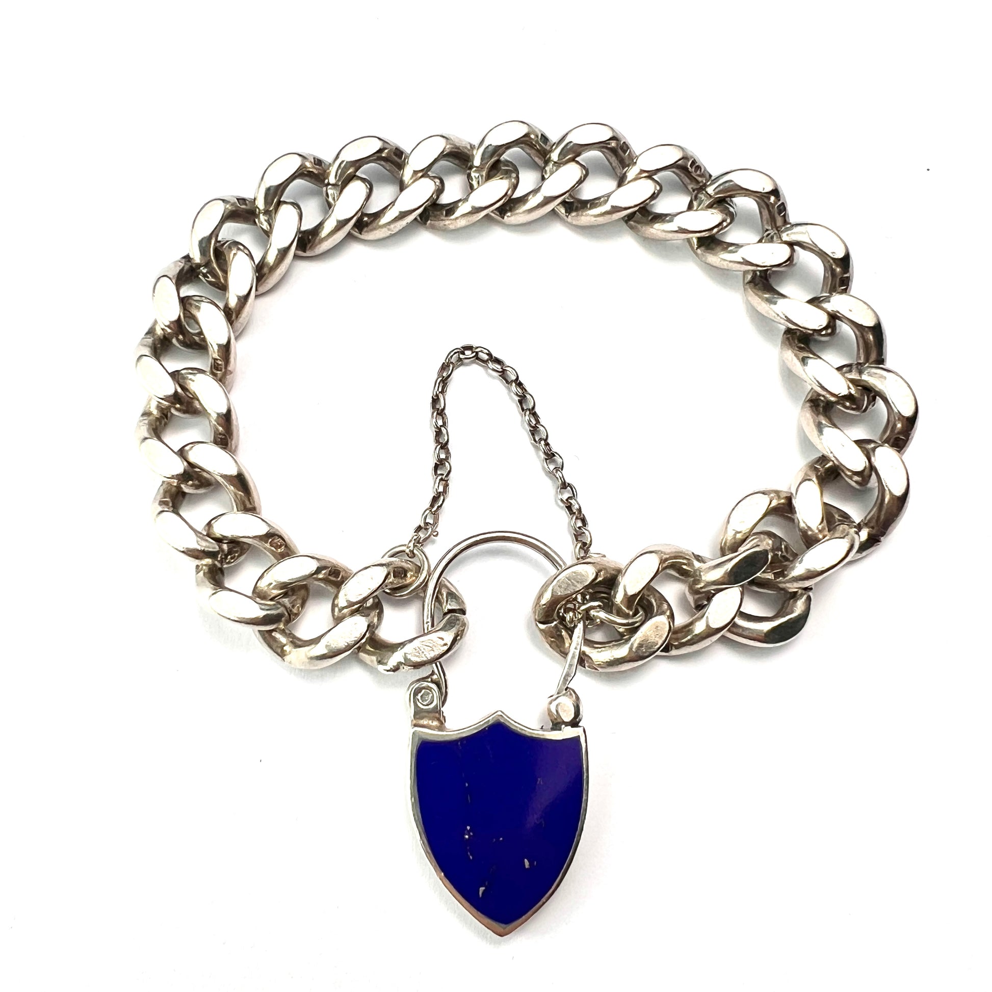 A lovely chunky antique curb chain bracelet which secures with a shield-shaped padlock and a safety chain for additional security. The padlock is inset with lapis lazuli in a beautiful shade of royal blue flecked with gold pyrite, and the back is engraved with a Scottish thistle.