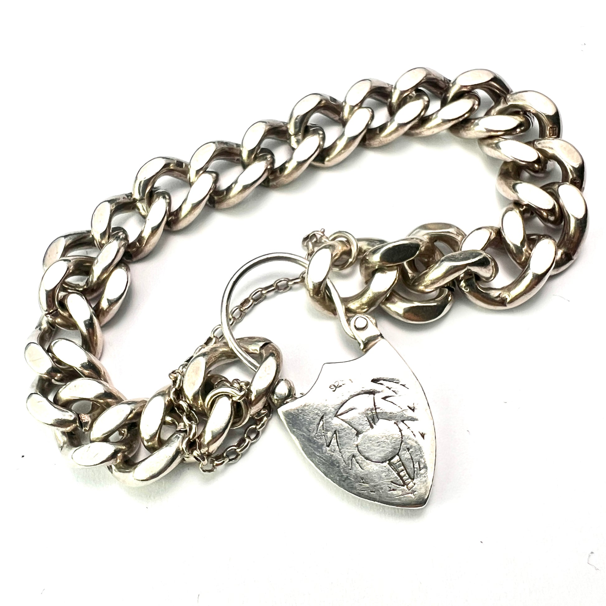 HALLMARKS/STAMPS: Each large link is stamped with the lion passant symbol for sterling silver. The padlock is marked 925.
