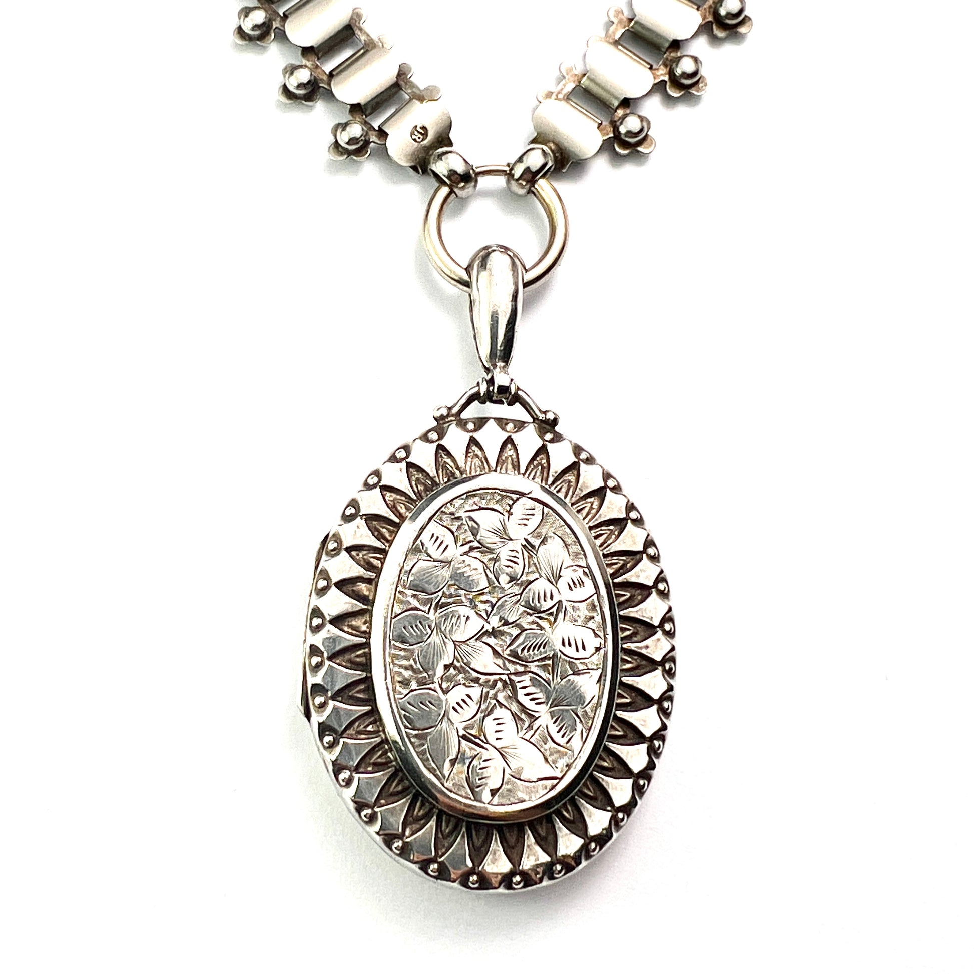 A beautiful Victorian book chain necklace in solid silver with a large ornate locket suspended from a supersized springring clasp. The locket is engraved to the front with gorgeously detailed ivy patterning - to the Victorians, well versed in the language of flowers, ivy represented enduring love, whether that meant a deep friendship or a romance. Both the locket and chain can be worn separately so you get three looks for the price of one!