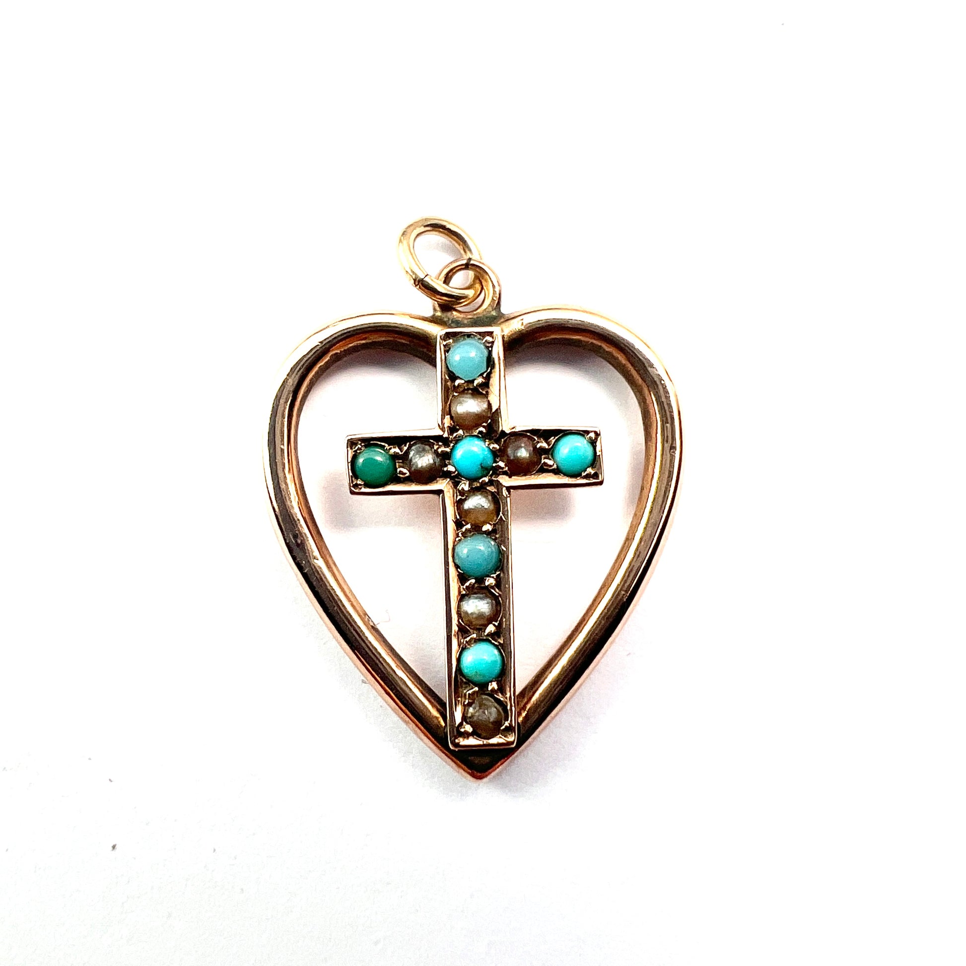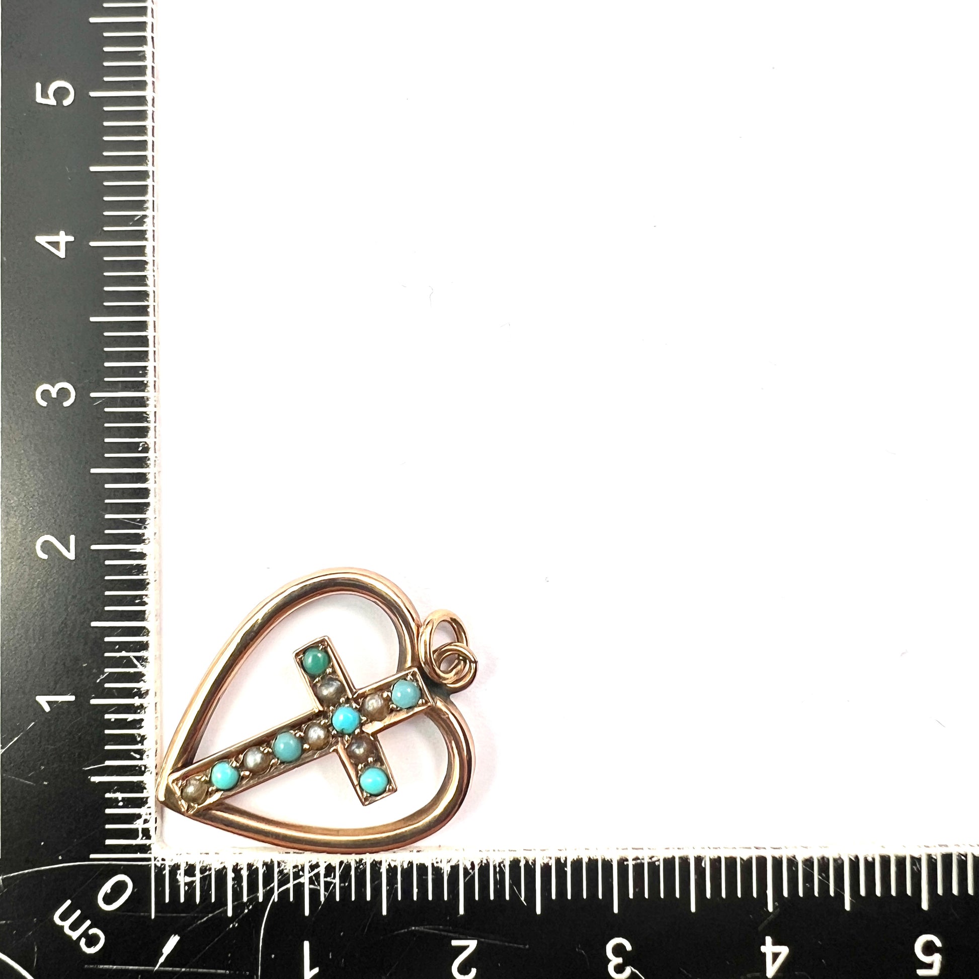 Victorian 9CT Gold Turquoise and Pearl Heart Cross Pendant