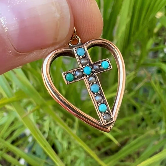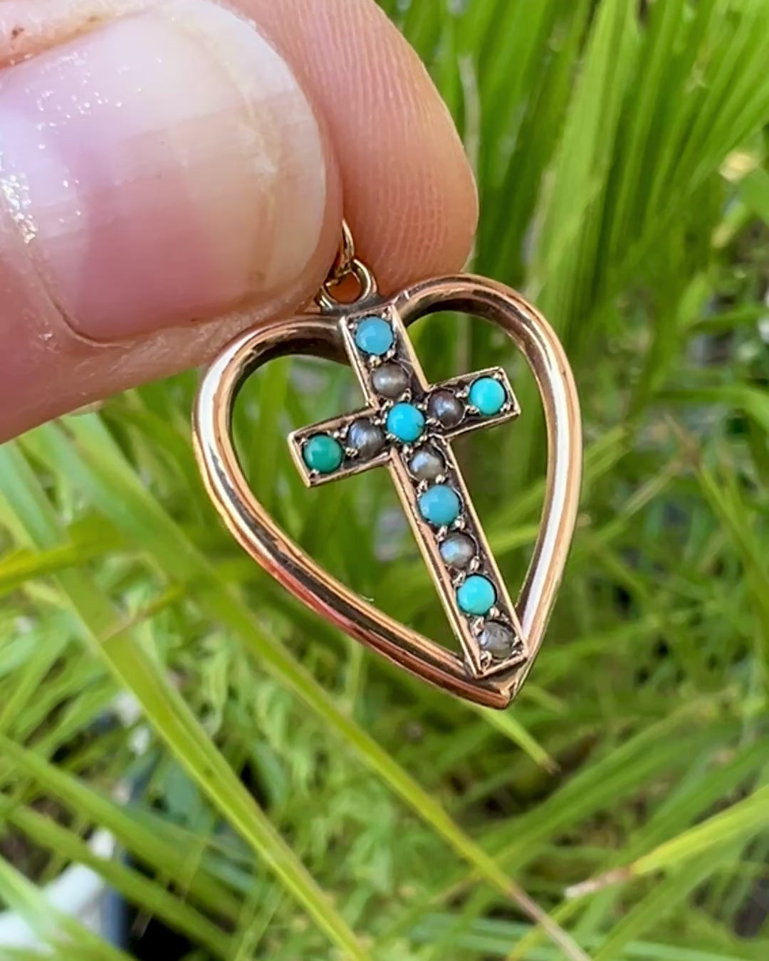 A pretty little antique gold pendant in the form of a turquoise- and pearl-studded cross centred within a heart-shaped frame. The gold is the lovely slightly rosy yellow colour typical of Victorian and Edwardian jewellery.