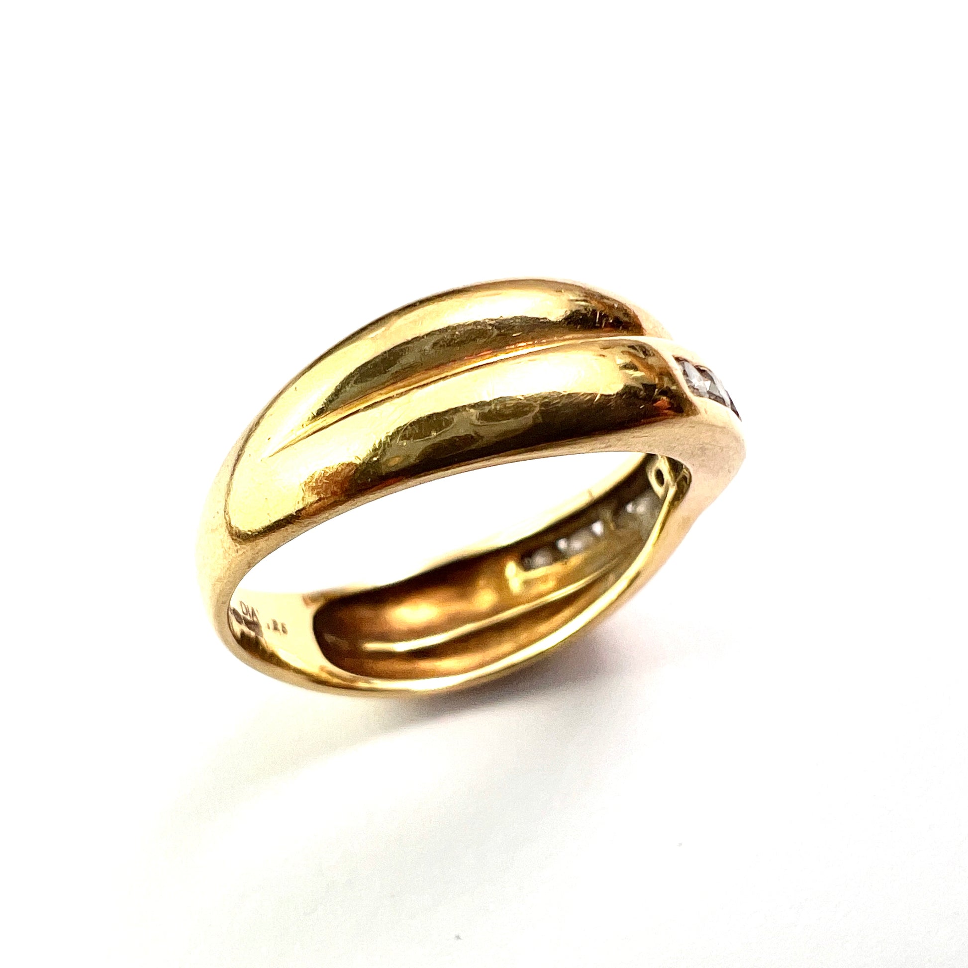 A beautiful vintage crossover ring in solid 18-carat yellow gold with 11 channel-set white diamonds. Very shiny and sparkly!