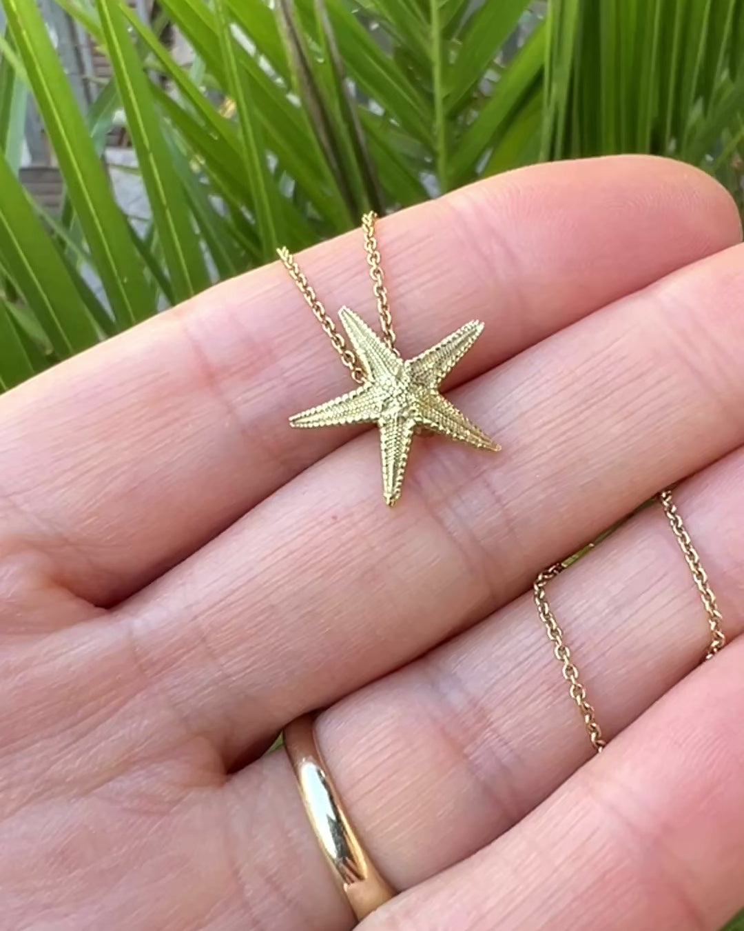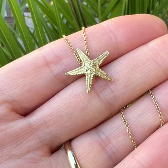 An incredibly detailed and realistic solid 18-carat-gold pendant in the form of a tiny starfish. Supplied ready to wear on a silver gilt chain.
