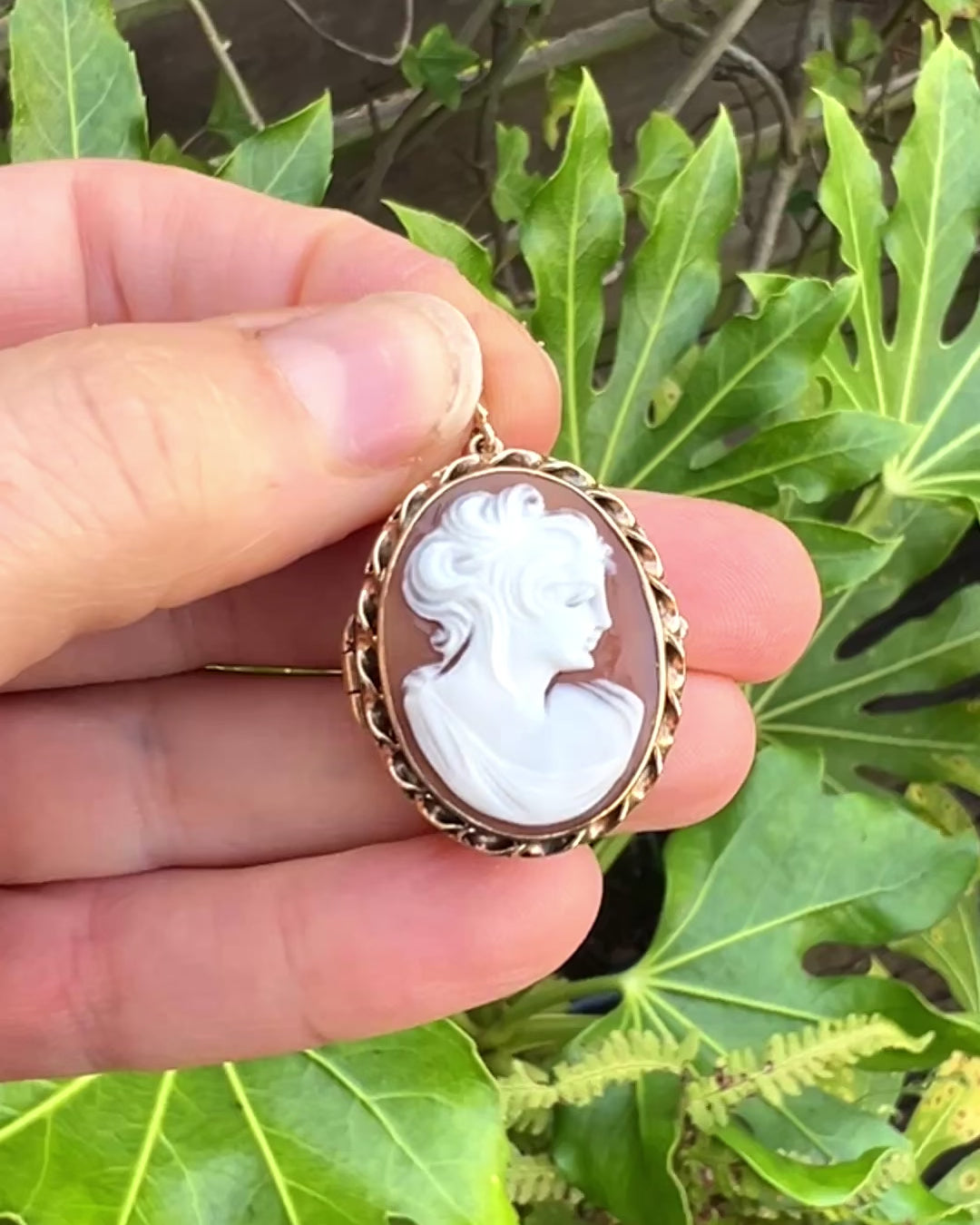 CONDITION: The piece is in very good vintage condition and sturdily made, with the hinge and clasp in good working order. There is a little glue residue on the back of the cameo (inside).