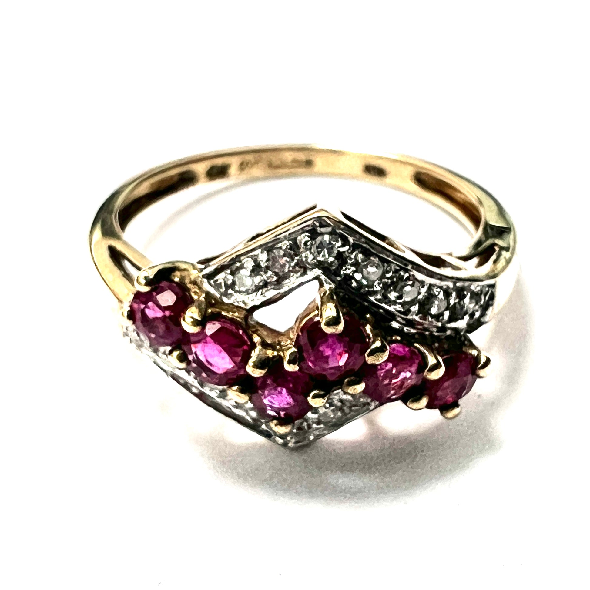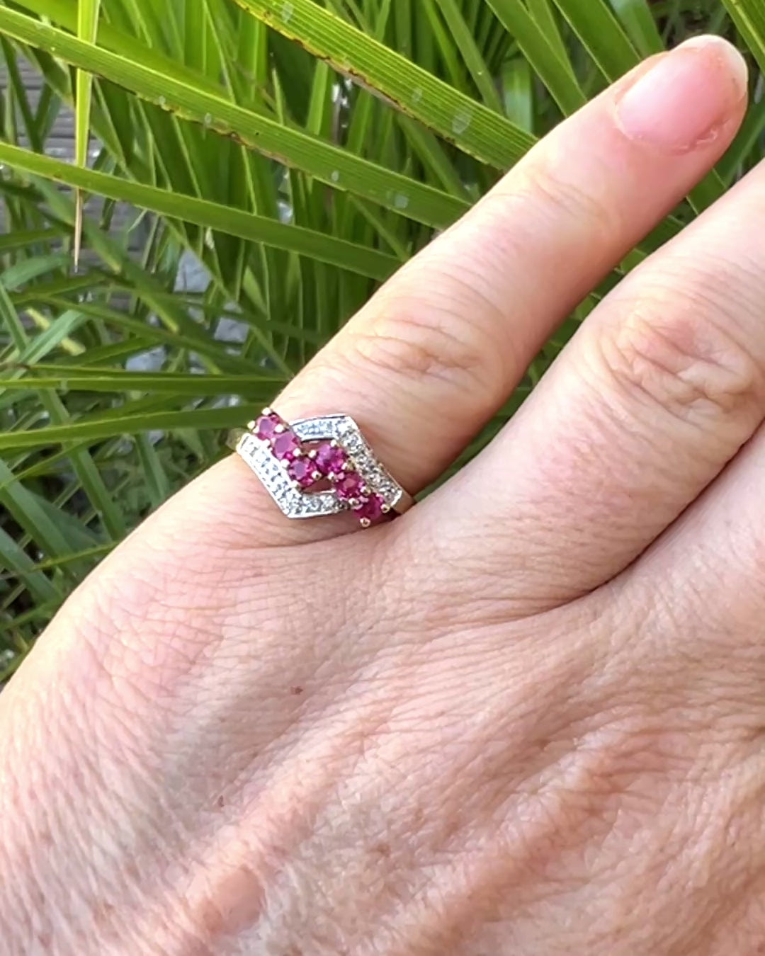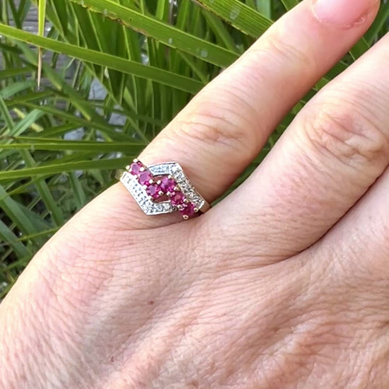 A lovely sparkly ring in solid nine-carat gold set with six faceted rubellites (a type of tourmaline) and 14 white diamonds. The gemstones are bright and lively and look fantastic on the finger.