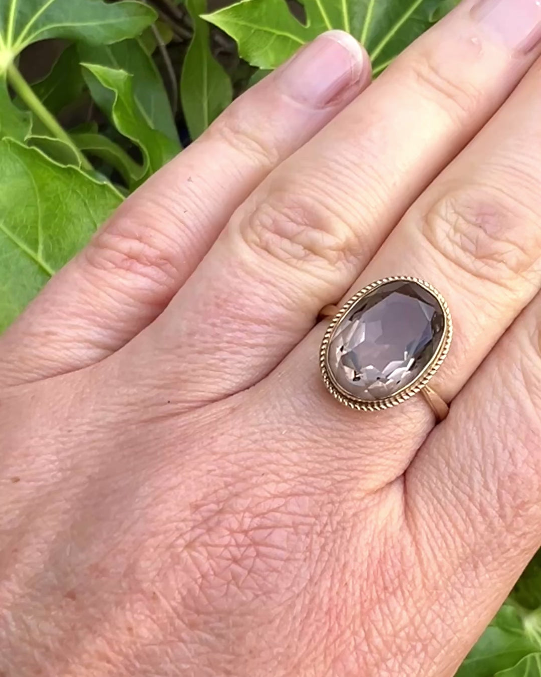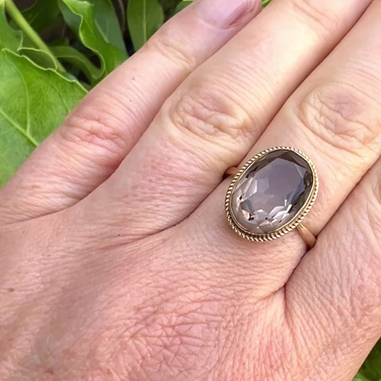 A vintage smoky quartz ring with lovely crisp rope-twist detail around a high gold bezel.