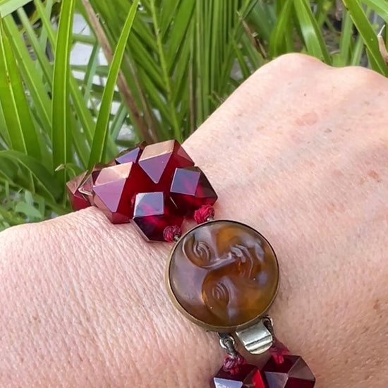 A gorgeous vintage bracelet formed of clear and opaque faceted cherry amber bakelite beads individually knotted on red silk. The star of the show is the beautiful amber-glass man-in-the-moon clasp, he's positively glowing!