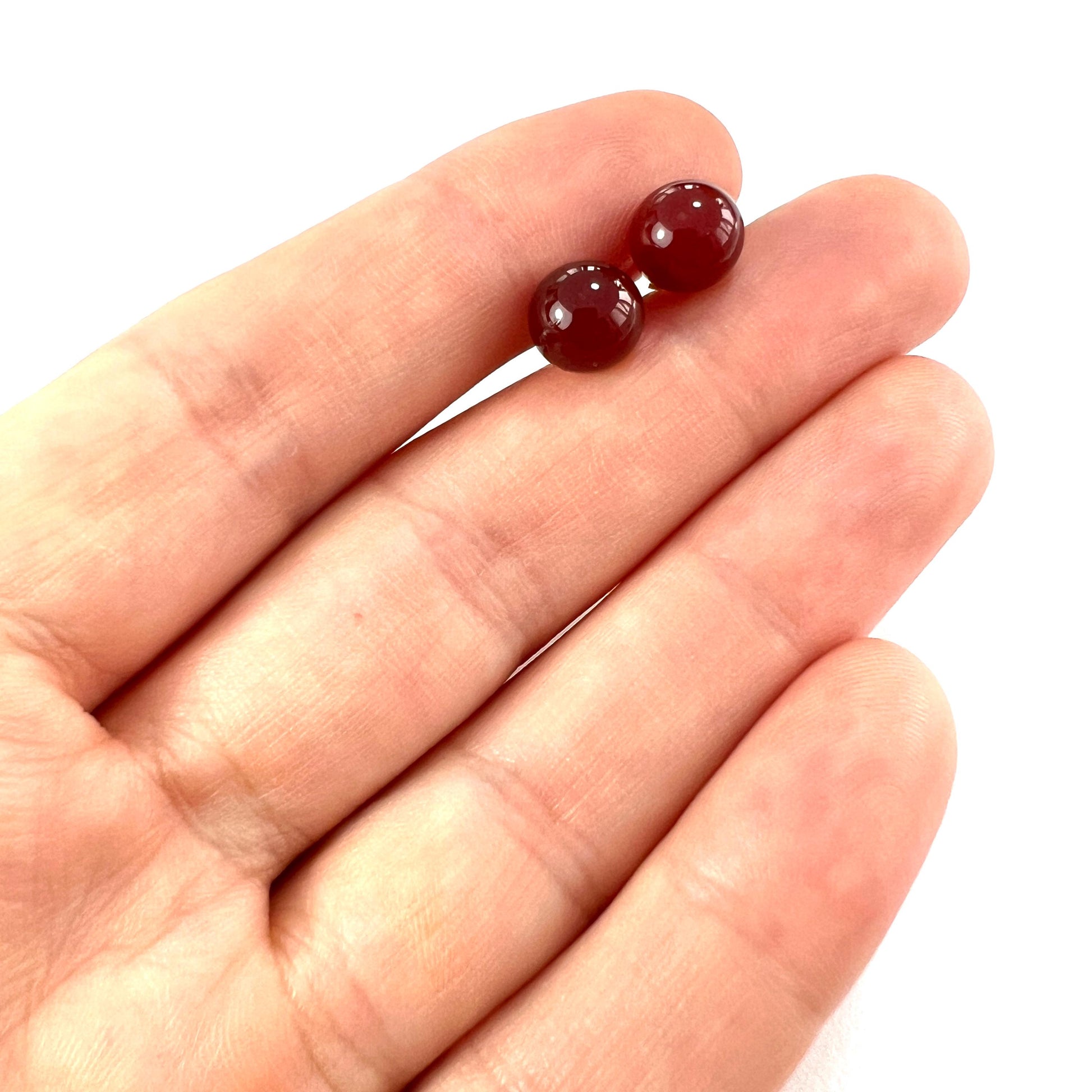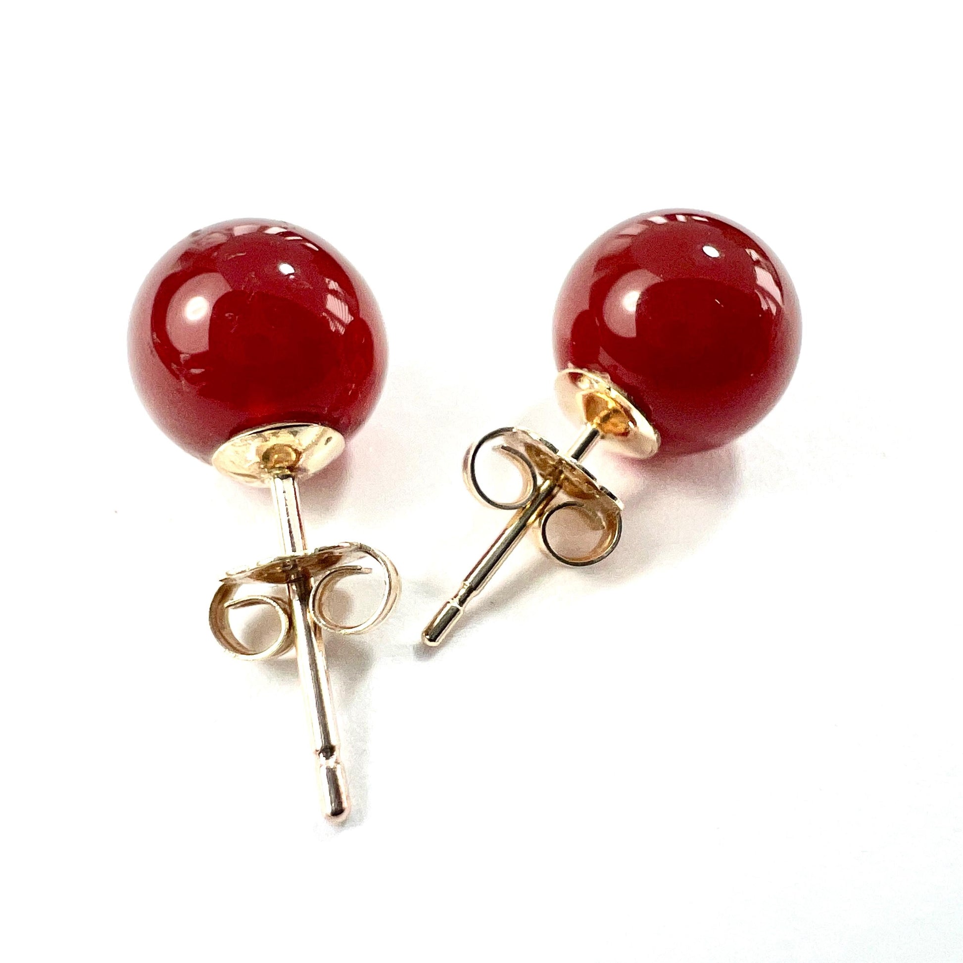 A classic pair of gemstone stud earrings - polished natural carnelian [cornelian] balls mounted on nine-carat yellow gold posts and secured with nine-carat gold butterflies.