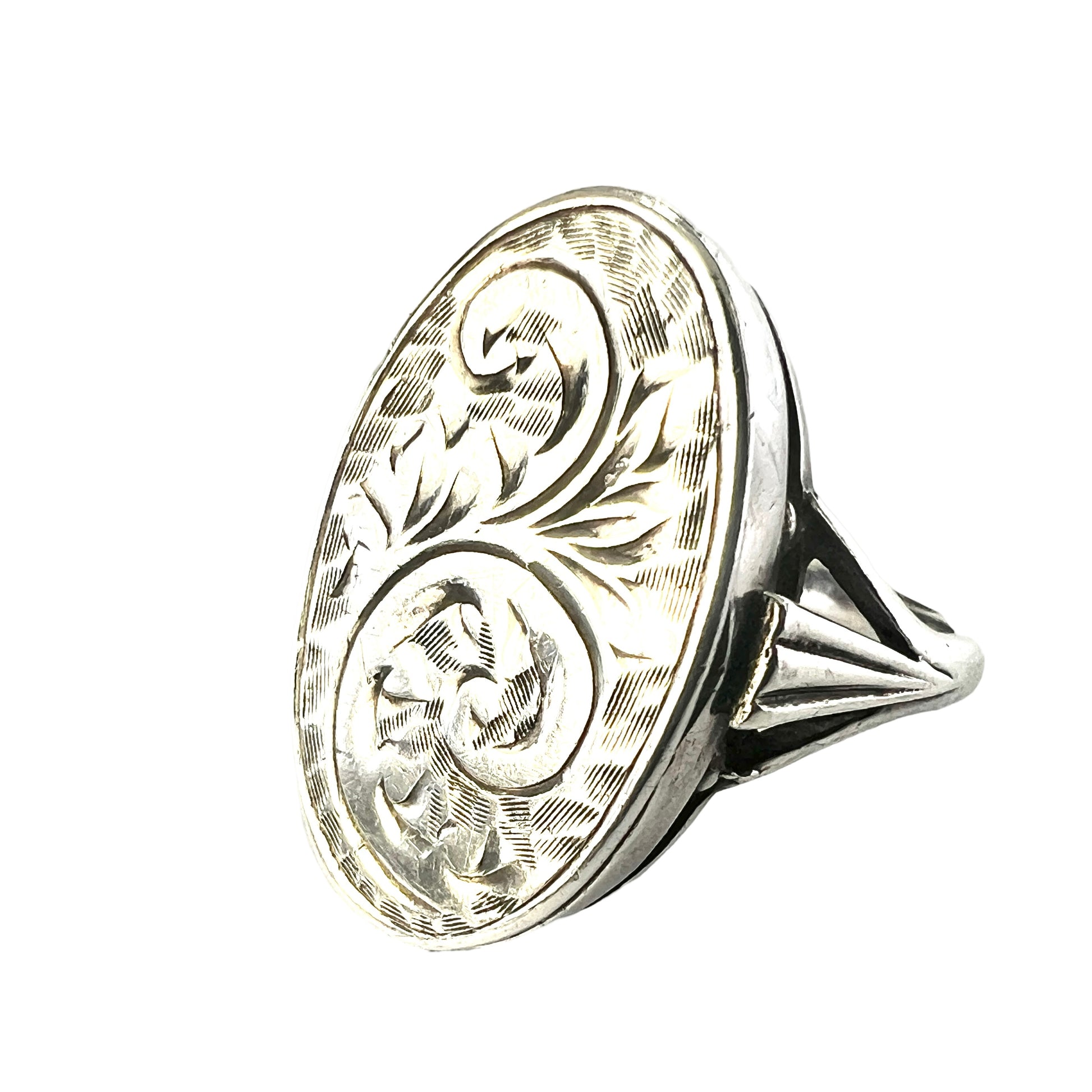 A lovely chunky solid silver ring with a Victorian-style engraved front which opens to reveal a tiny sprig of dried flowers inside a concealed locket.