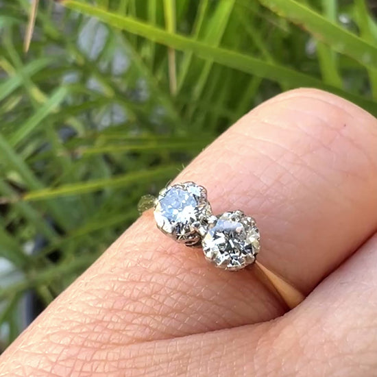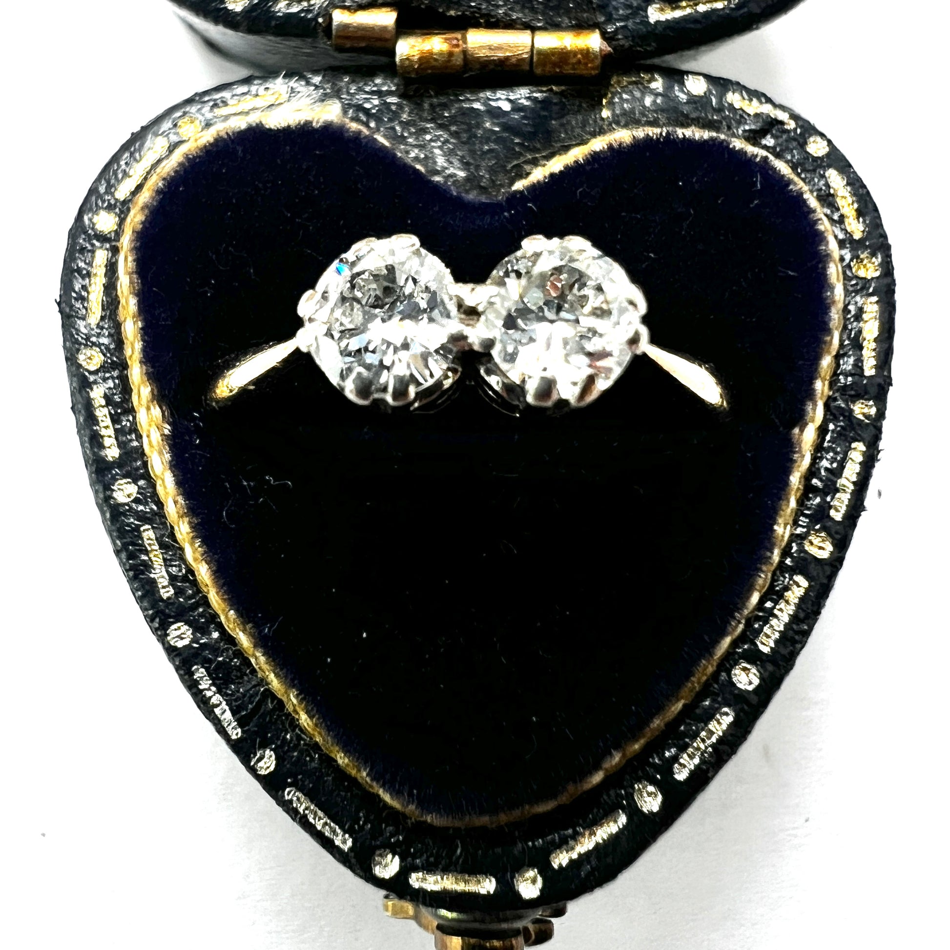 A fabulous vintage two-stone diamond ring in 18-carat gold which won't fail to be noticed. The platinum-set diamonds measure 4.5mm diameter, totalling approximately 0.75CT, and are white and fiery and super sparkly!