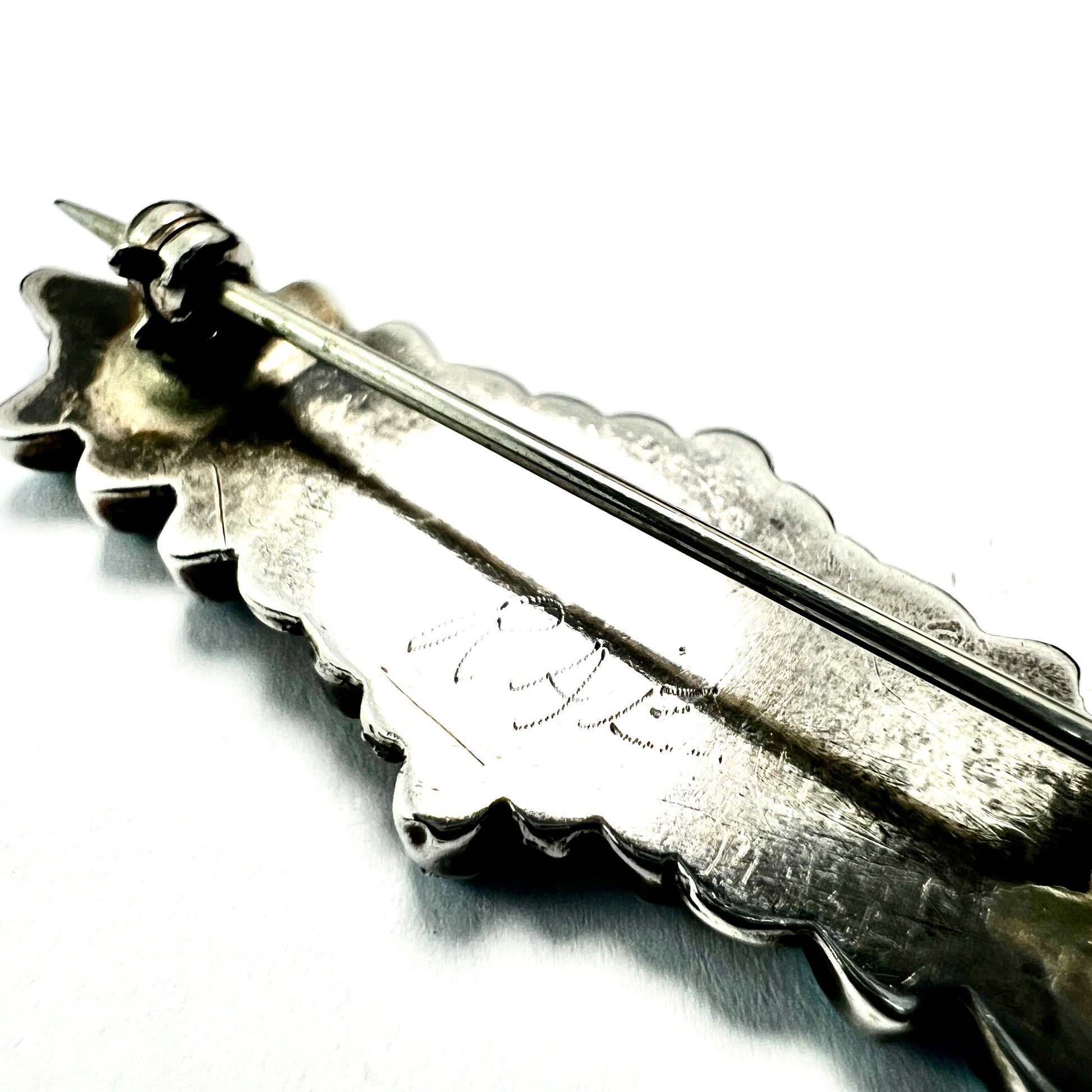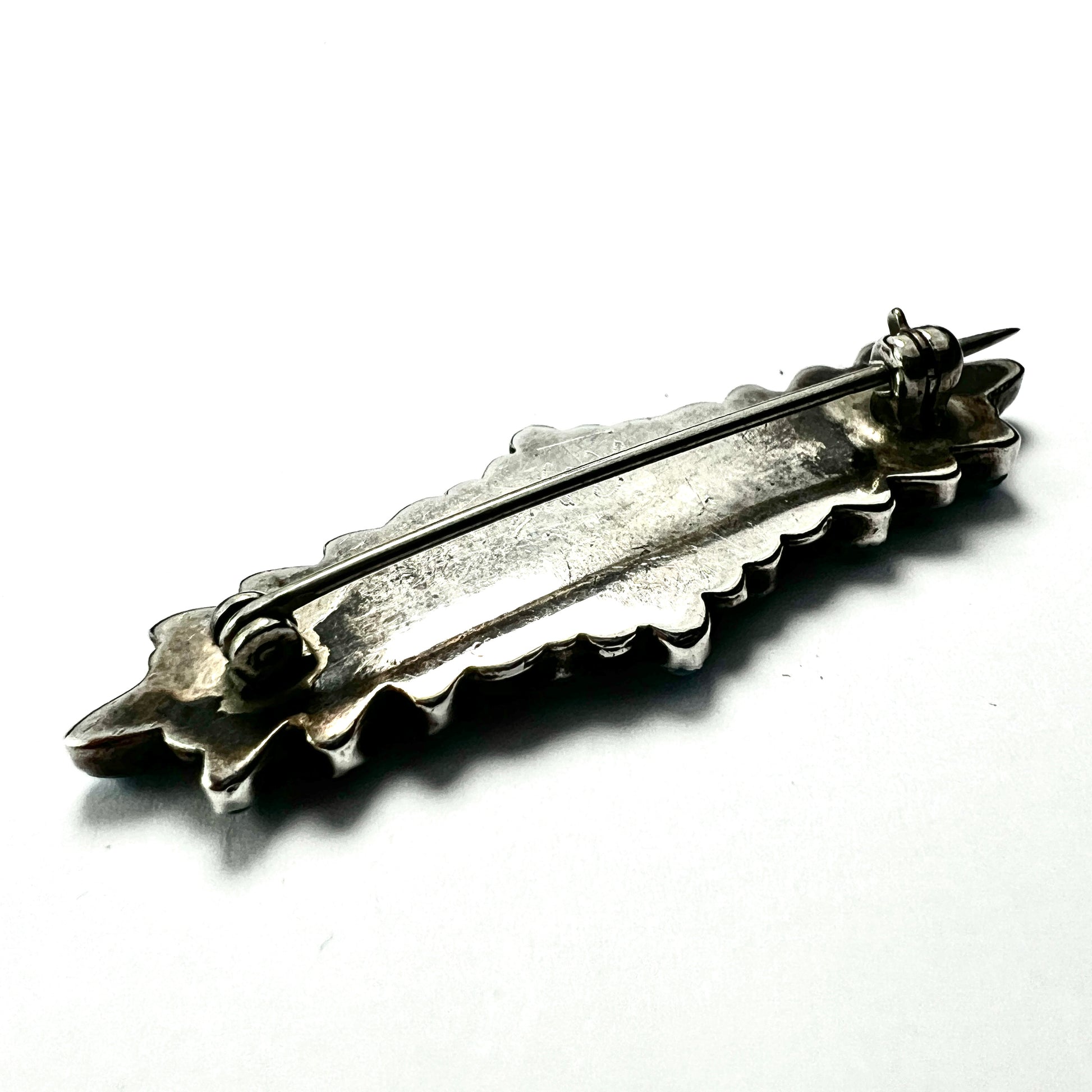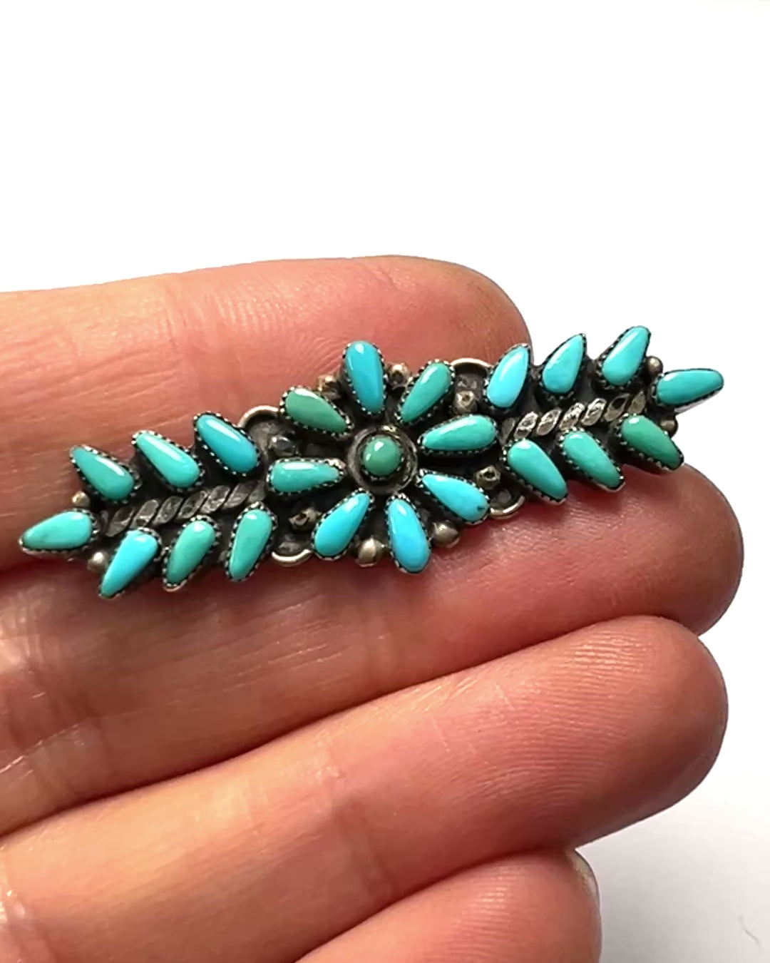 A fantastic vintage silver Native American brooch set with 23 lovely vivid turquoises in a range of hues.